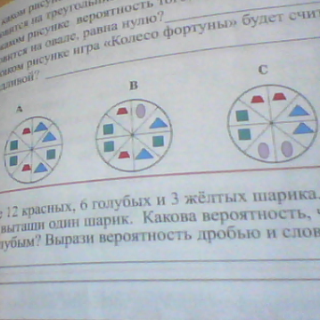 1)На каком рисунке вероятность того,что стрелка<>остановиться на треугольнике наименьшая? 2)На каком рисунке вероятность того,что стрелка<>остановиться на овале,равна нулю? 3)На каком рисунке игра<>будет считаться справедливой?