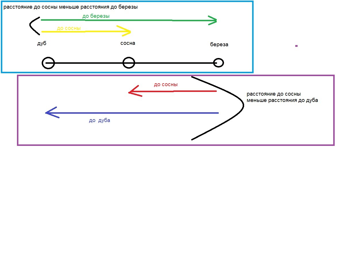 чтобы расстояние с любой стороны было меньше, хотя бы одного из расстояний до дуба или березы, сосна должны быть в середине. остальное на рисунке