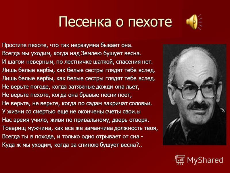 Чётко звучит недоверие к бравости и геройству,автор ненавязчиво вложил это в название как "песенки",а не бравой песни о пехоте, не стыдясь показать страх живых людей перед смертью в описании пехоты-"Не верьте пехоте, когда она бравые песни поёт"… Жестокость судьбы,горечь о погибших близких,выражает риторический вопрос-"куда ж мы уходим,когда за спиною бушует весна?"Анафора,повторение начальных строк, усиливает важность мысли -"У жизни и смерти еще не окончены счёты свои."