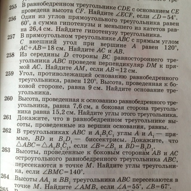 Номер 255: в равнобедренном треугольнике CDE с основанием CE проведена высота CF.Найдите угол ECF,если угол D равен 54 градуса