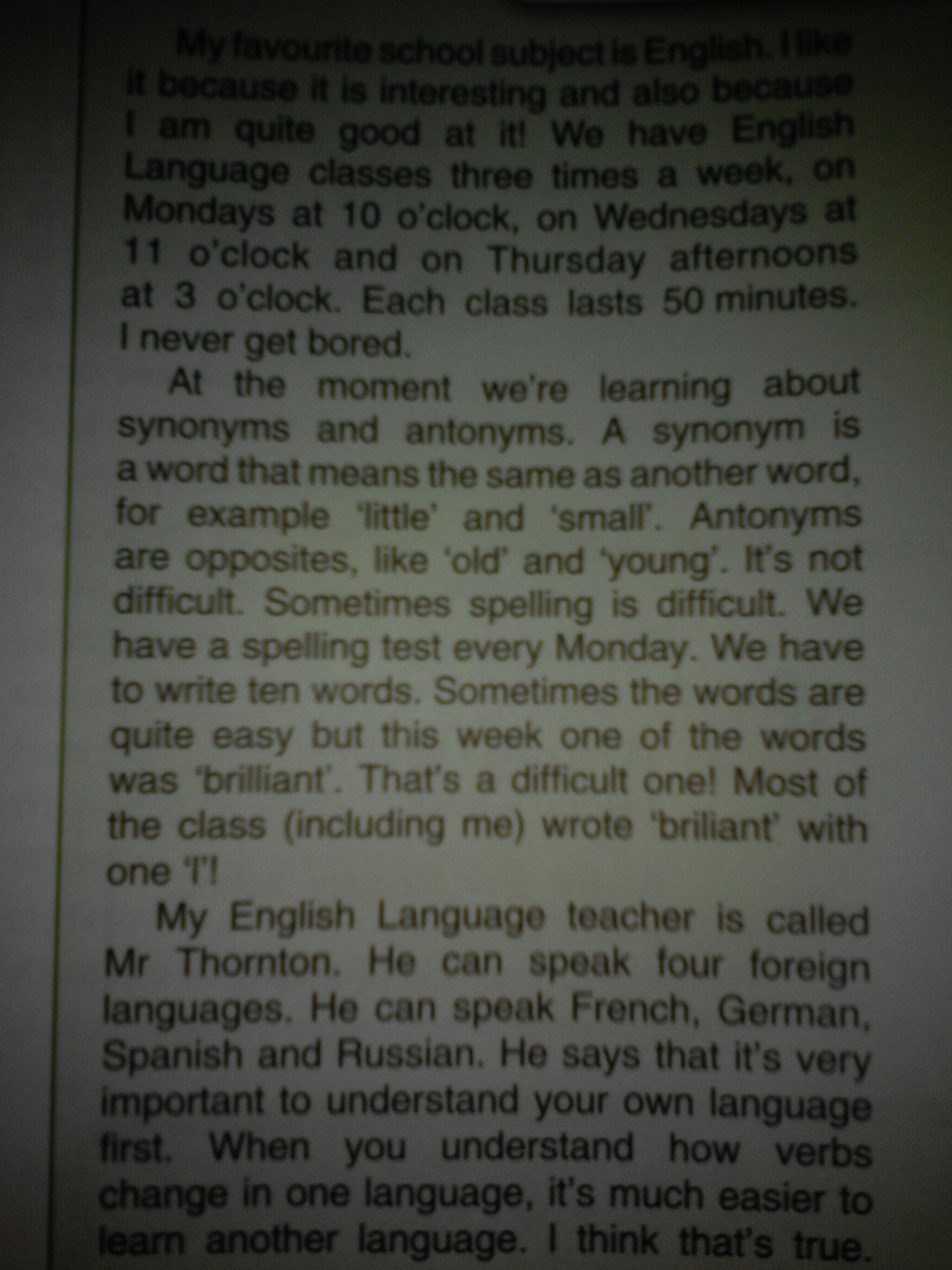 В настоящий момент мы изучаем синонимы и антонимы. Синоним-это слово, которое имеет одинаковое значение с другим словом, например "маленький" "маленький". Антонимы это противоречие, как "старый" и "молодой". Это не сложно. Иногда правописание трудно. У нас тест по правописанию каждый понедельник. Мы пишем десять слов. Иногда слова очень легкие, но на этой неделе одно из слов было "brilliant". Это трудно слово! Большинство из класса(включая меня) написали "brilliant" c одной "l"