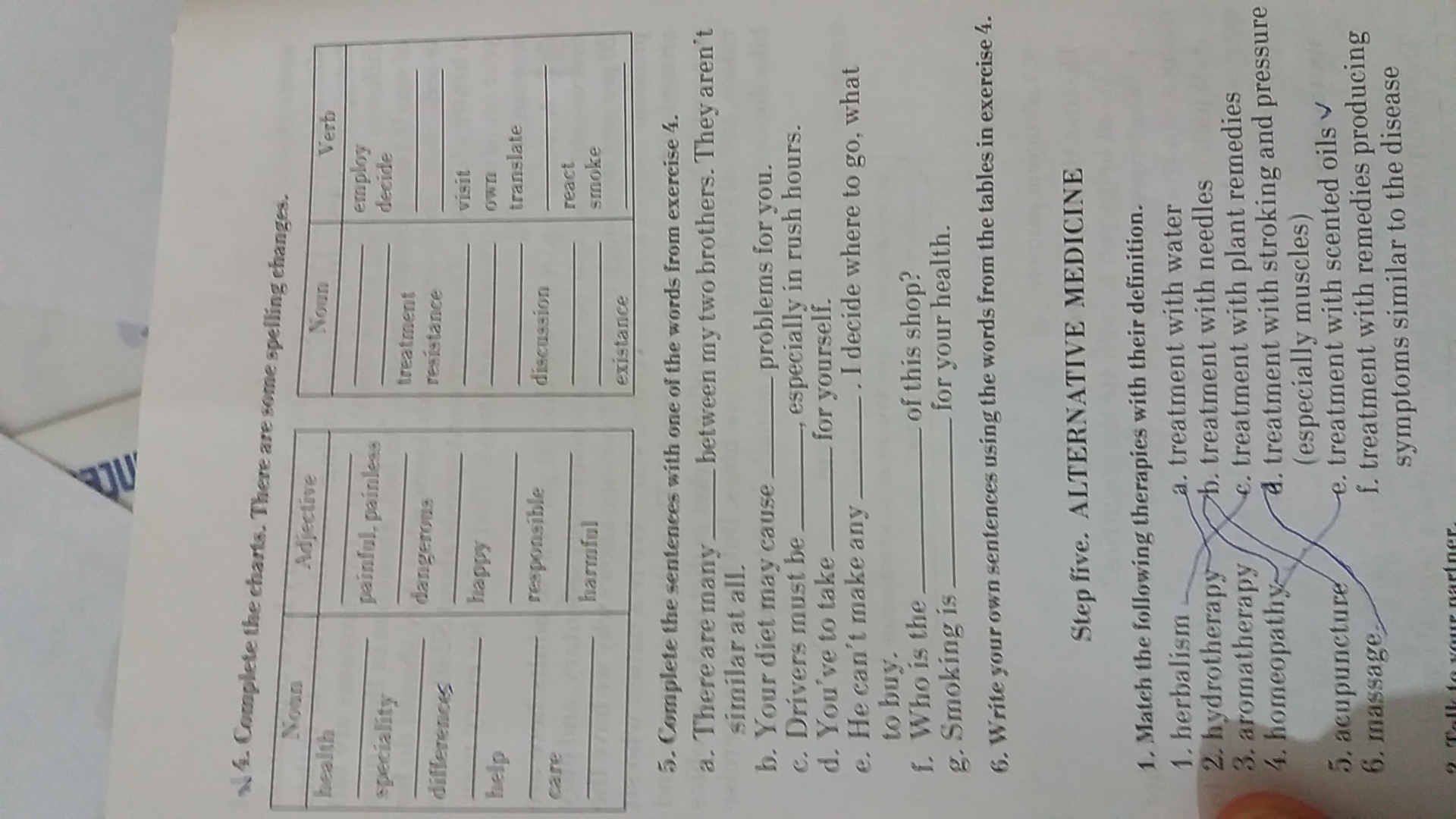 (4) healthy, pain, special, danger, different, happiness, helpful, responsibility (responsibilities), careful, harm, employment, decision, treat, resist, visitation, ownership/owner, translation, discuss, reaction, smoking, exist. (5) a. Differences b. Health c. Careful d. Responsibilities e. Decisions f. Owner g. Dangerous