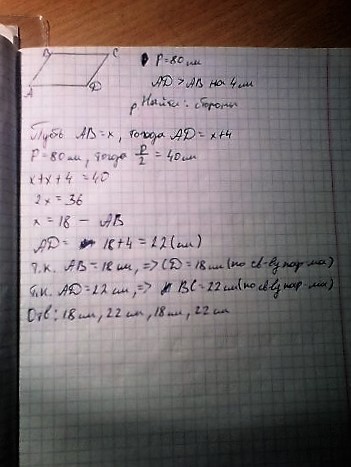 умоляяю решите мне задачу,периметр пароллелограма 80 см,одна из его сторон на 4 см больше другой найдите длины сторон параллелограма