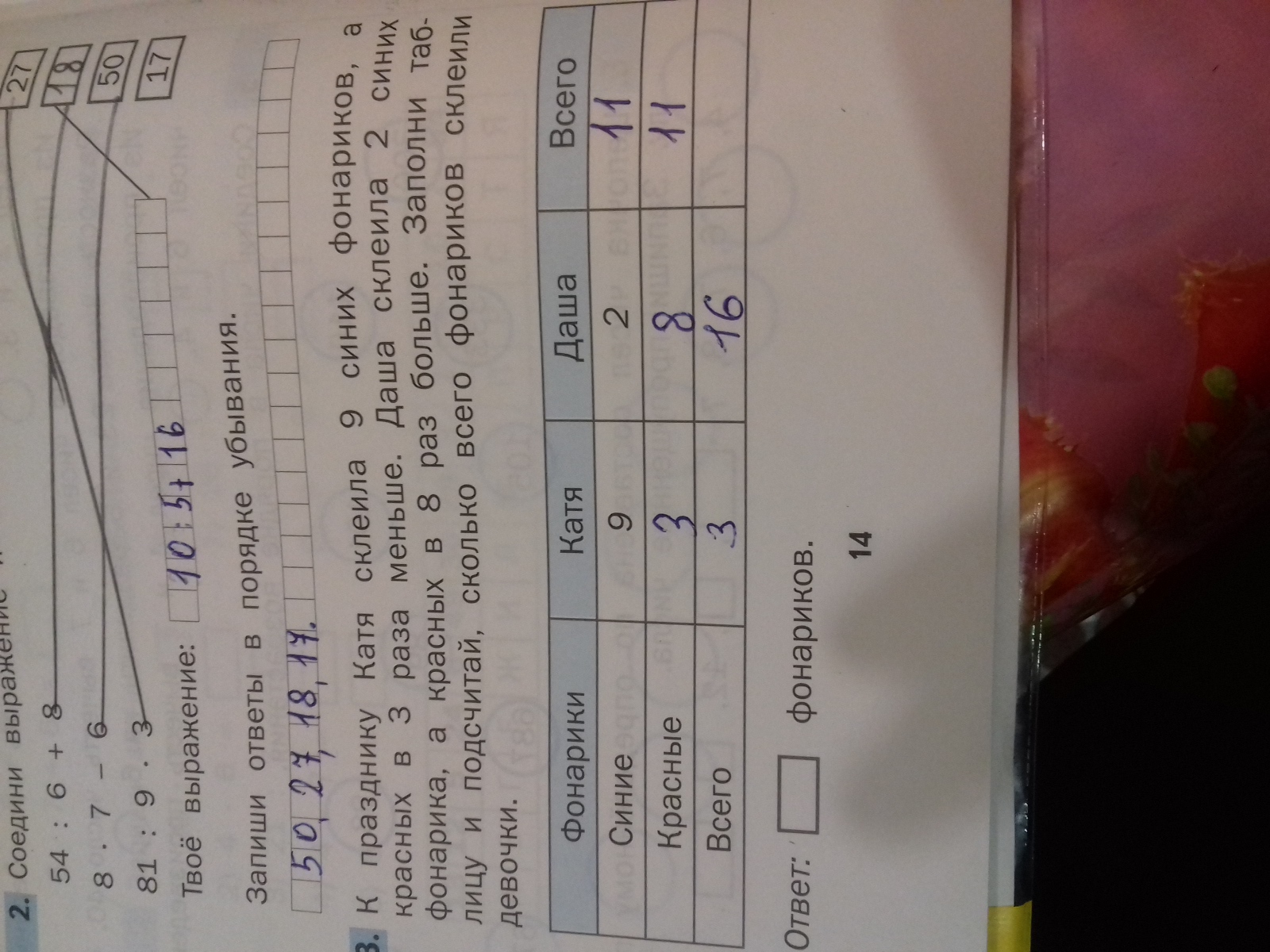 К празднику Катя склеила 9 синих фонариков,а а красных в 3 раза меньше.Даша склеила 2 синих фонарика,а красных в 8 раз больше.