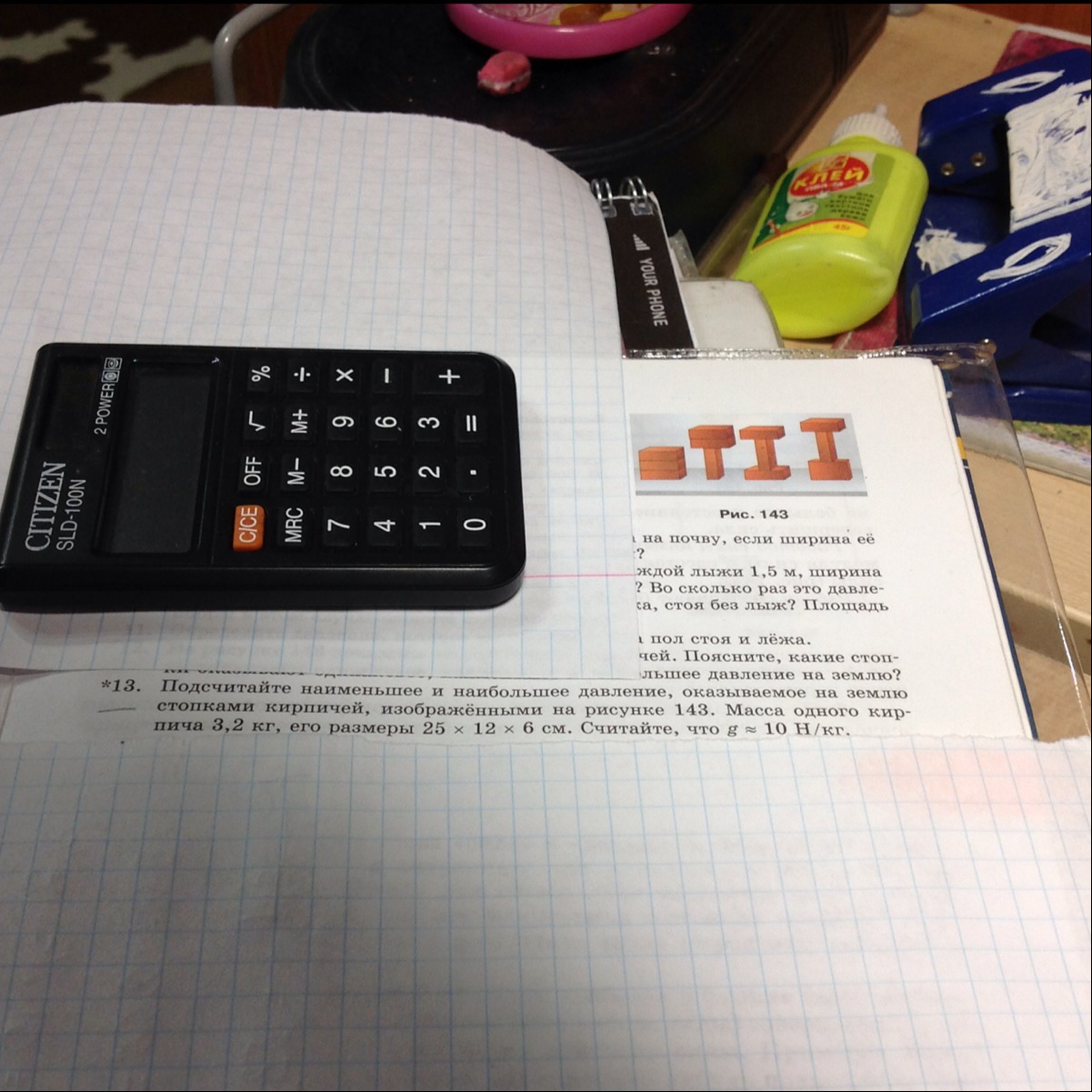 масса кирпичей всегда = 16 кг, сила тяжести всегда =160 Н Определяем площади S1=0.25*0.12=0.03 м² P1=160/0.03=5333.33 Па