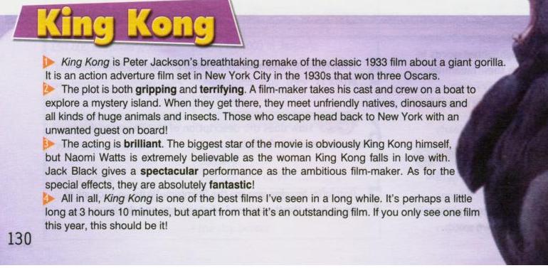 4. В общем, "Кинг-Конг" - один из лучших фильмов, которые я только видел за очень долгое время. Может быть, 3 часа 10 минут - немного длинновато, но за исключением этого фильм выдающийся. Если бы в этом году у вас была бы возможность посмотреть только один фильм, "Кинг-Конг" для этого вполне подходит!