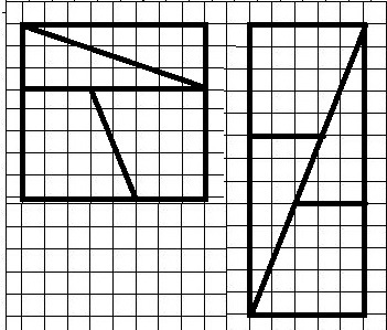 вырезать из листа клетчатой бумаги квадрат 8 на8 начертить 5 отрезков разрезать квадрат с угла на угол .сдвинуть половинки на одну клетку.вместо пяти отрезковосталось четыри куда исчезла 1 отрезок