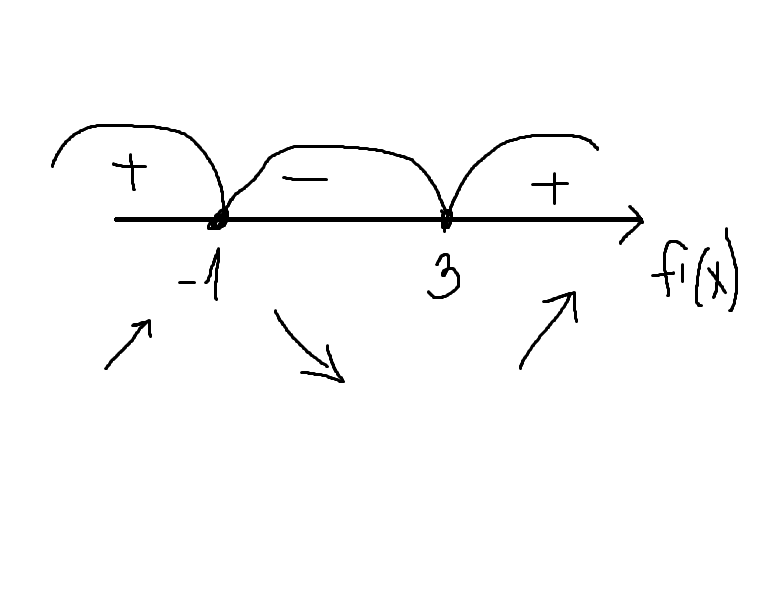 f(x) возрастает на промежутках (-бесконечность;-1);(3;+бесконечность)