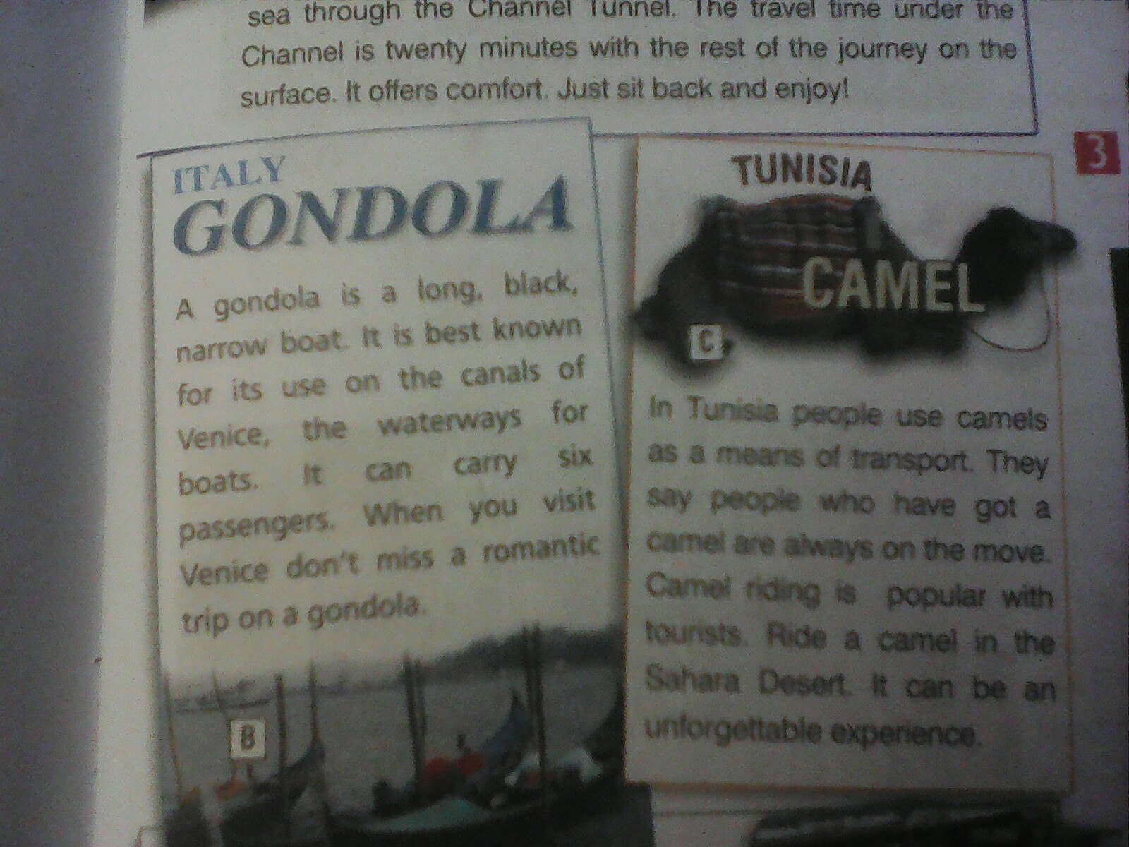 с) в Тунисе люди используют верблюдов как средство передвижения (вид транспорта). Там говорят, что люди, у которых есть верблюды всегда на ходу. Верблюды также популярны среди туристов. Покатайтесь верхом на верблюде по пустыне Сахара. Это должно стать незабываемым опытом.