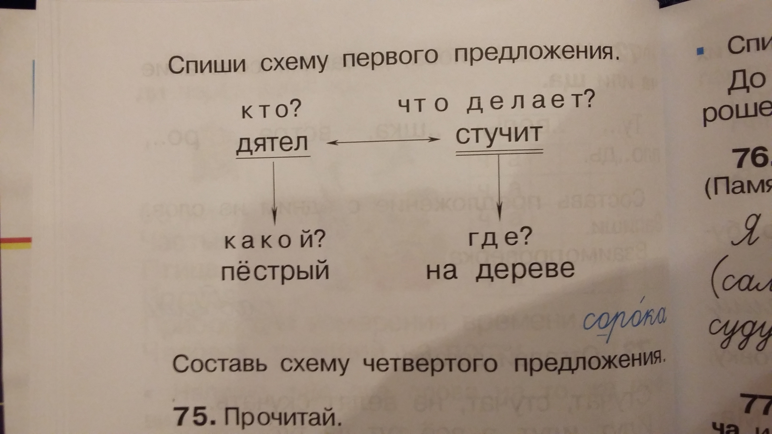 1.пёстрый дятел стучит на дереве.2.сорока трещит. 3. птенецпищит.4.грач громко кричит.