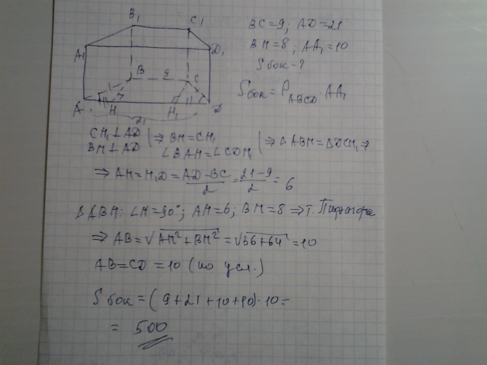 основанием прямой призмы является равнобедренная трапеция с основанием 10 сантиметров и 9 сантиметров высота 80 см Найдите площадь боковой поверхности если боковое ребро равно 10 метров