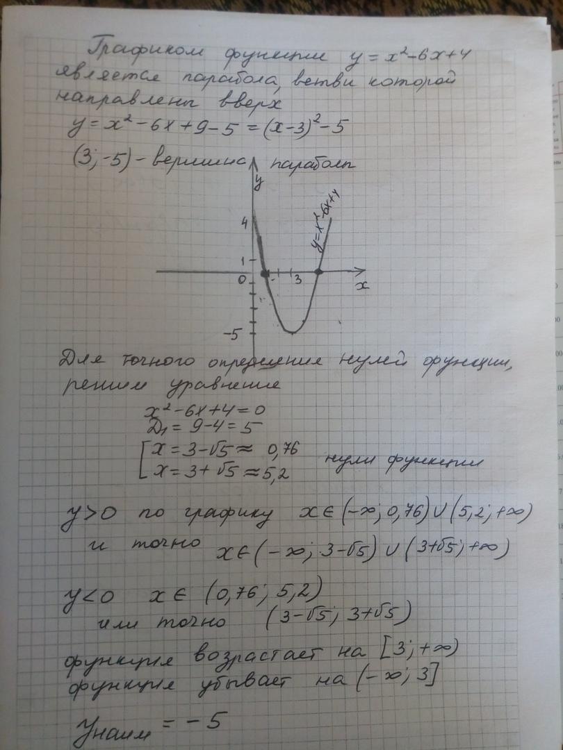 Постройте график функции y=x^2-6x+4. Найдите по графику: а)нули функции; промежутки, в которых y<0, y>0; б) промежутки убывания и возрастания