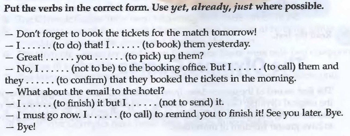 1)I will do it,Booked.2)Did you pick up.3)did not be,called,confirmed.4)finished,did not send,5)called