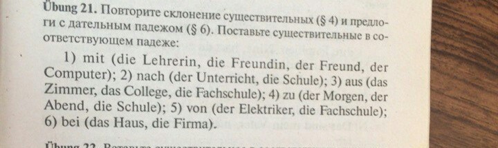 1 der Lehrerin, der Freundin, dem Freund, dem Computer 2 dem Unterricht, der Schule 3 dem Zimmer, dem College, der Fachschule 4 zum Morgen, zum Abend, zur Schule 5 vom Elektriker, von der Fachschule 6 beim Haus, bei der Firma