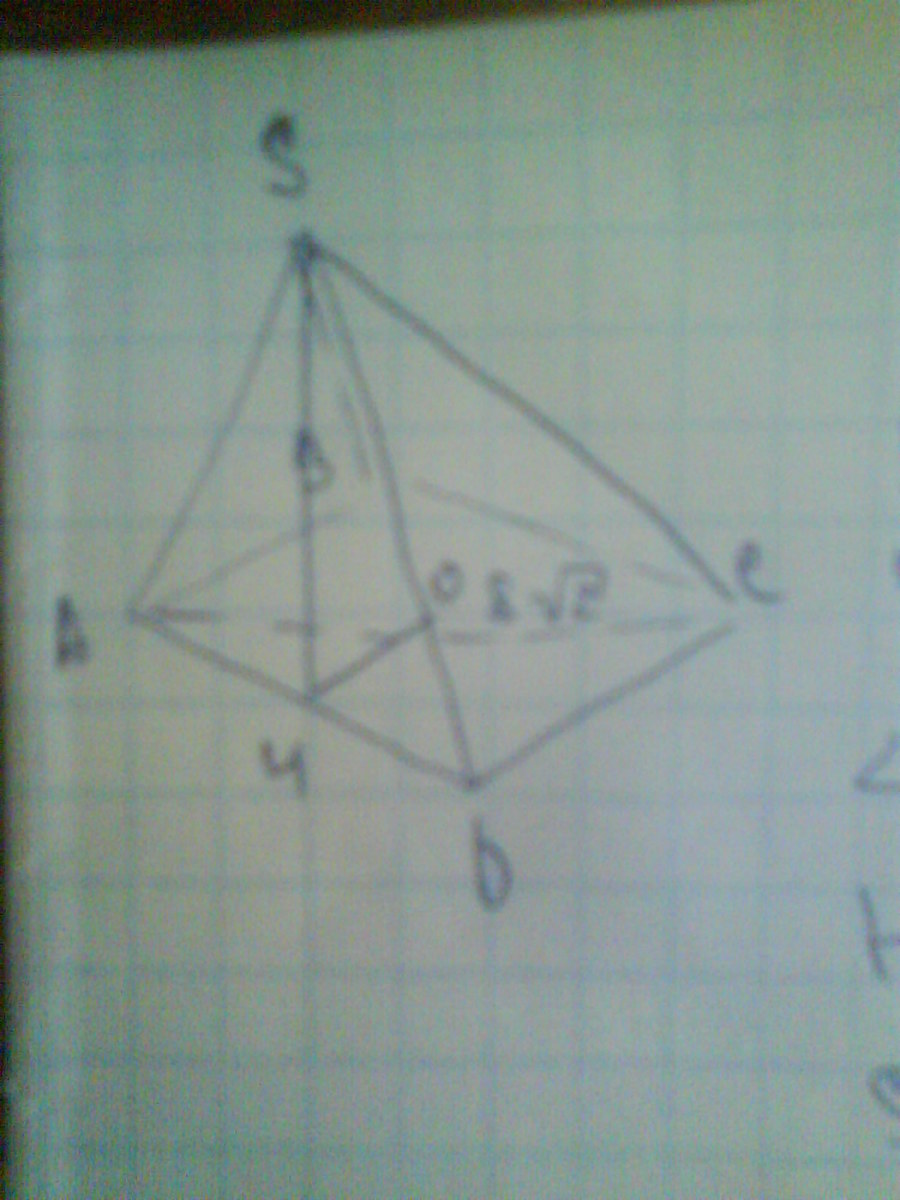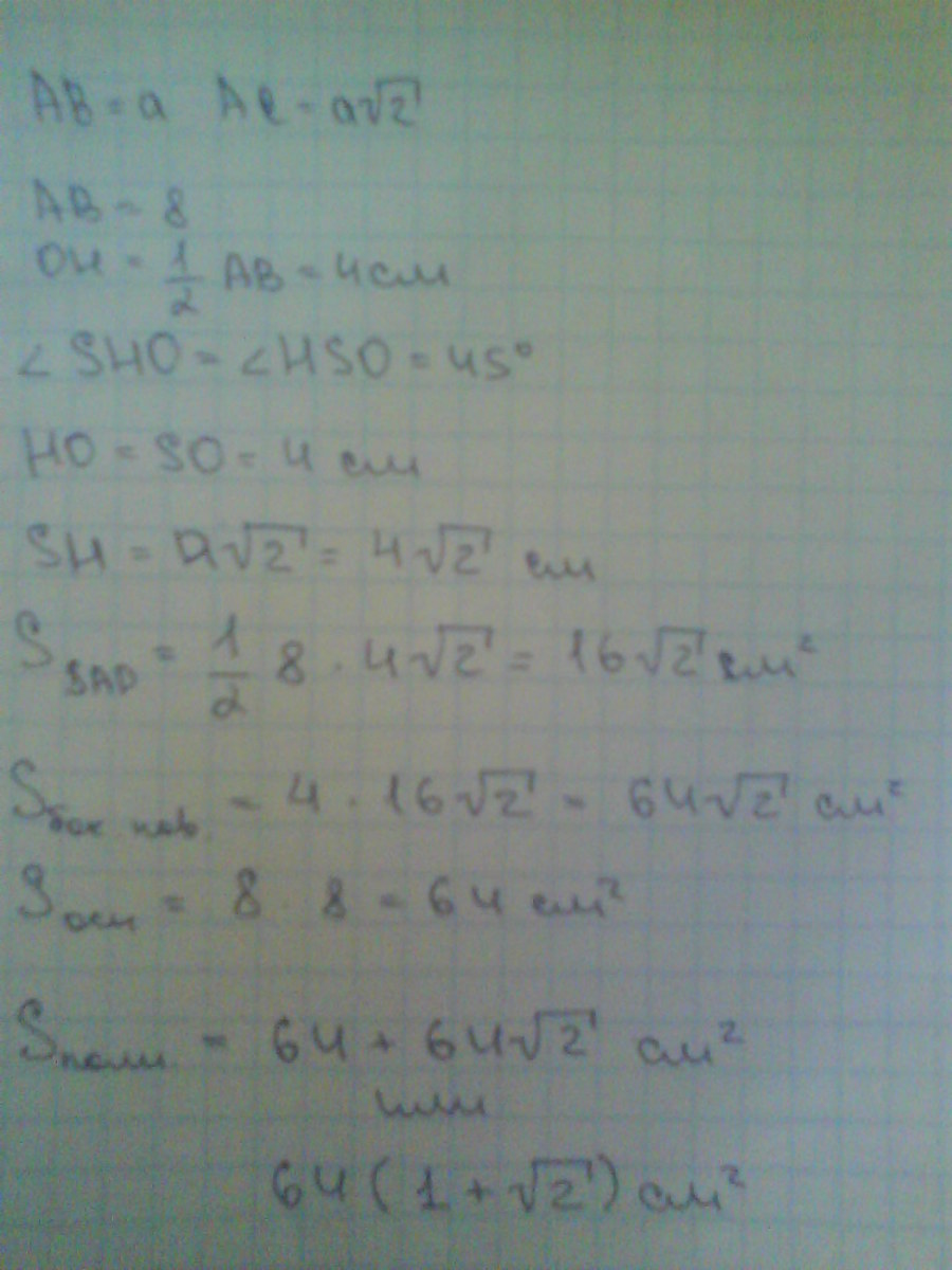 В правильный четырёхугольной пирамиде диагональ основания 8 корней из 2 см, а двухгранный угол при основании = 45 градусов. Найти площадь полной поверхности пирамиды