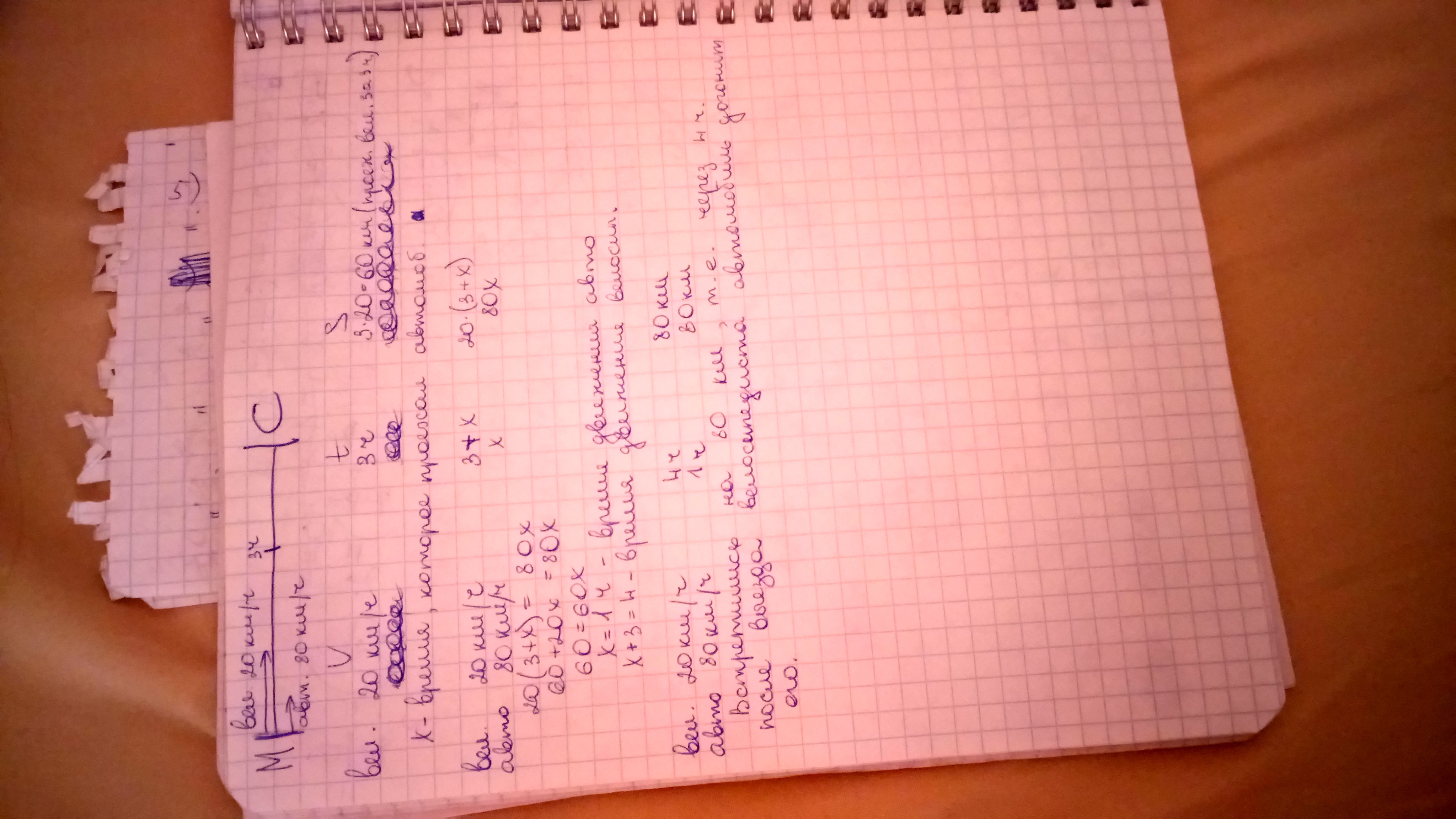 25 баллов за подробное объяснение!Из Москвы в Серпухов отправился велосипедист со скоростью 20 км/ч. Через 3 часа в том же направлении выехал автомобиль со скоростью 80 км/ч .Через какое время после выезда велосипедиста его догонит автомобиль?
