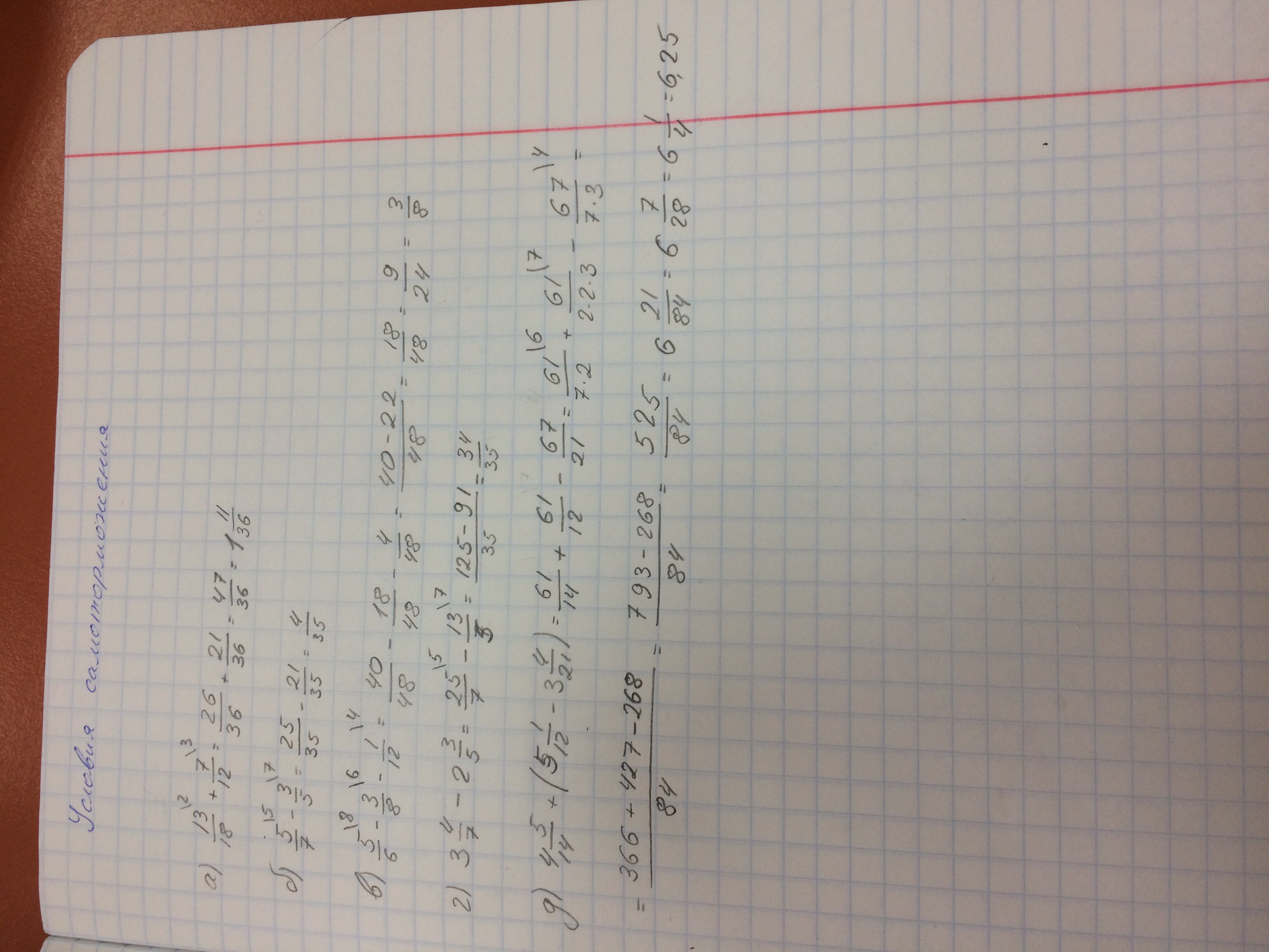 Выполните действия: а) 13/18 + 7/12; б) 5/7 — 3/5; в) 5/6 — 3/8 — 1/12; г) 3 4/7 — 2 3/5; д) 4 5/14 + (5 1/12 — 3 4/21).