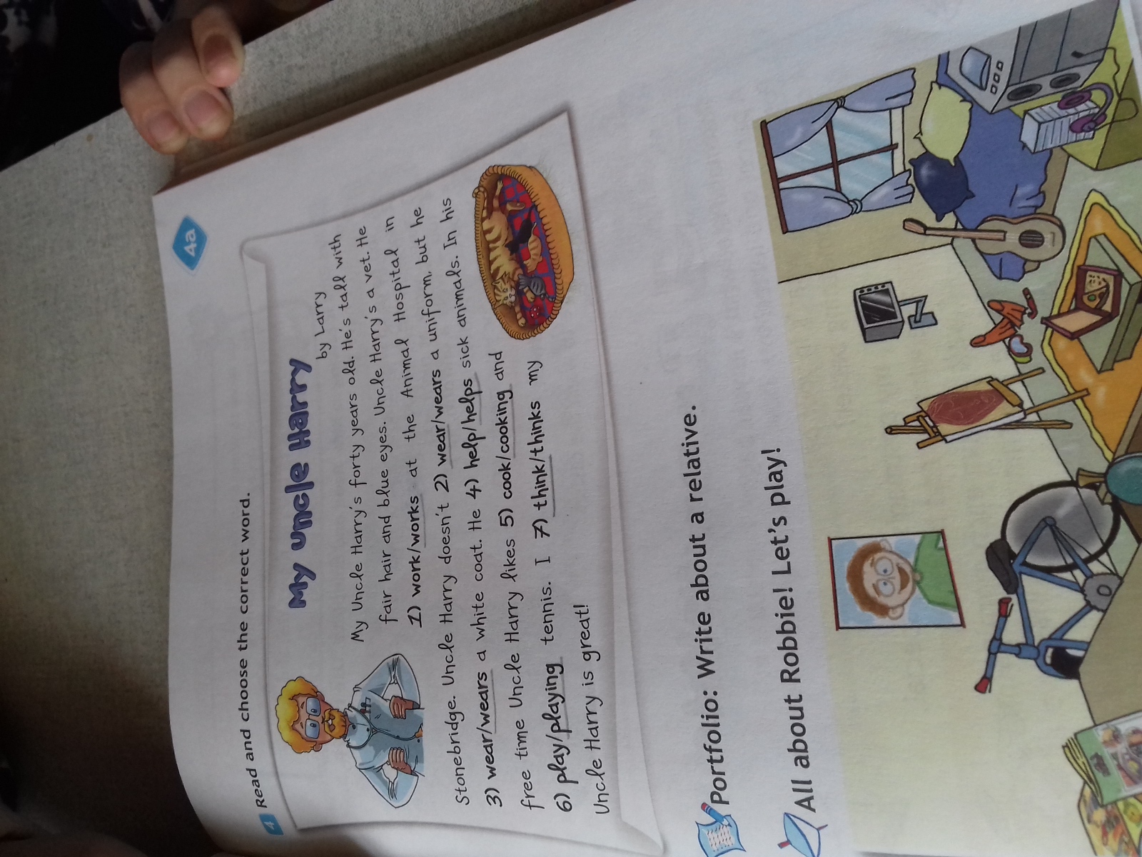 Моему дяде Гарри 40 лет. Он высокий, светловолосый и с голубыми глазами. Он (works) работает в больнице для животных в Стоунбридже. Дядя Гарри не носит (wear) униформу, но он носит (wears) белый халат. Он помогает (helps) больным животным. В свое свободное время дядя Гарри любит готовить (cooking) и играть в теннис (plaing). Я думаю (think) мой дядя Гарри классный.
