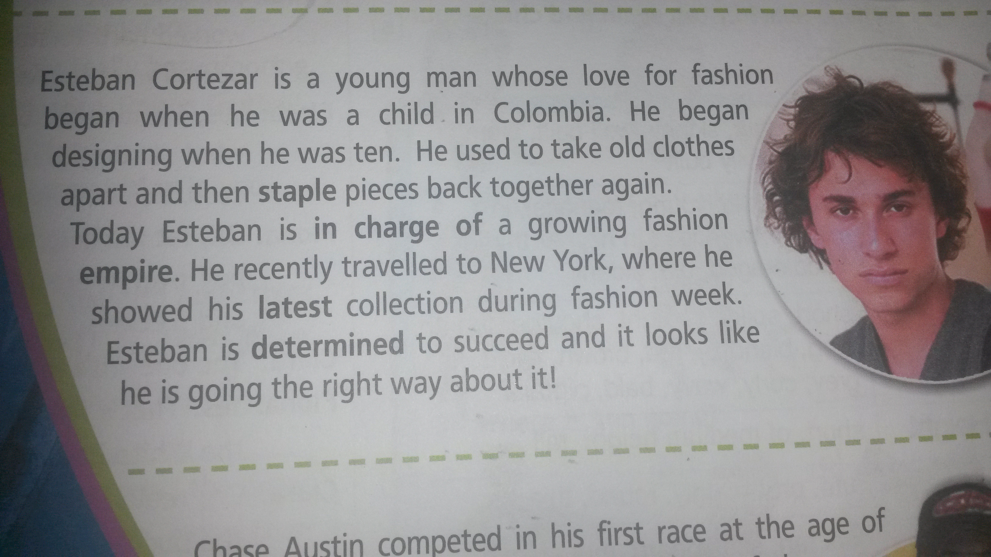 Эстебан Cortezar-молодой человек, чья любовь к моденачалось, когда он был ребенком в Колумбии. Он началпроектировании, когда ему было десять. Не брал старую одеждуврозь, а потом сшивать кусочки снова вместе.Сегодня Эстебан отвечает за растущую модаимперии. Не недавно ездил в Нью-Йорк, где онпоказал свою последнюю коллекцию в течение недели моды.Эстебан полон решимости преуспеть, и это похожеон идет правильным путем об этом!