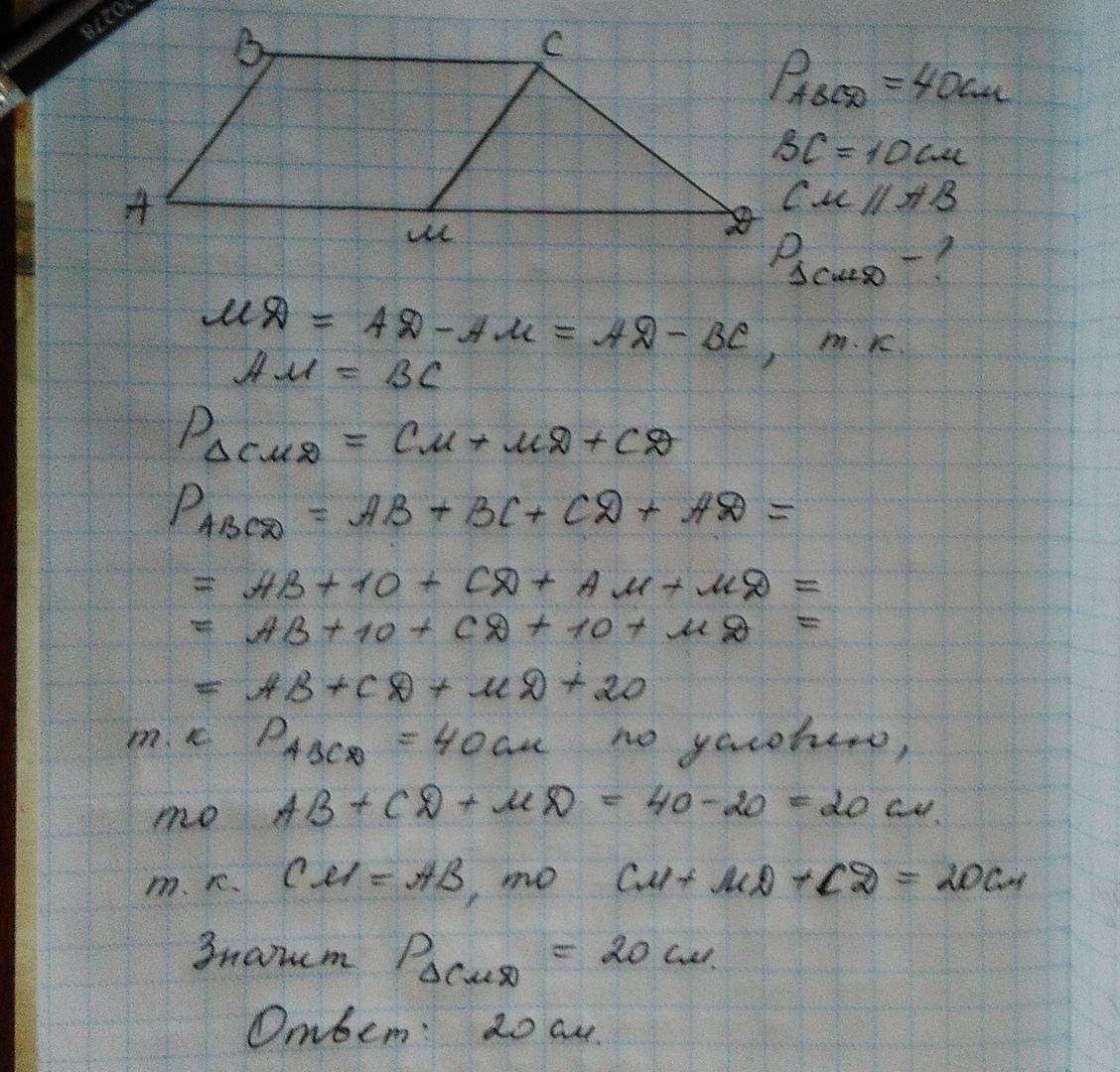 Периметр трапеции равен 40 см, меньшее основание 10 см. через конец меньшего основания проведена прямая параллельная боковой стороне трапеции.Найти