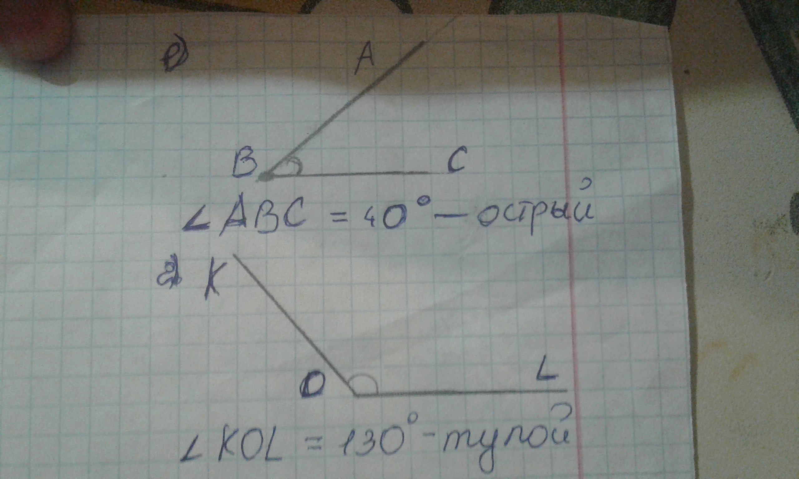 Проведите луч. Отложите от этого луча угол, градусная мера которого равна1):40º;2)130º.Определите вид каждого из построенных углов