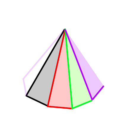 В пирамиде все грани - треугольники. На каждую новую грань будет уходить два новых ребра (см. картинку). Собственно 28/2=14.