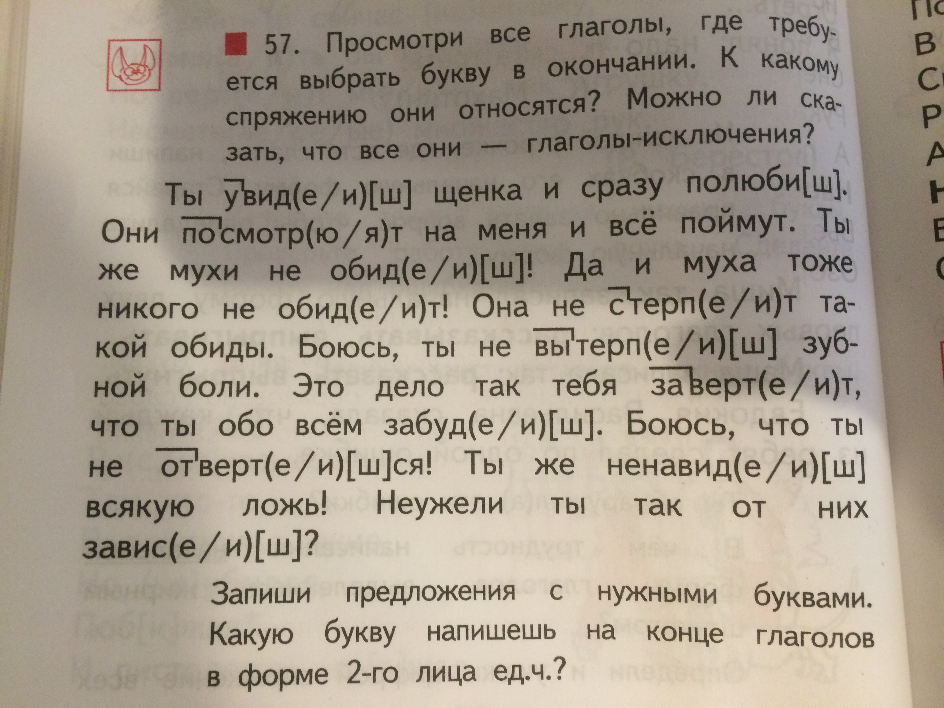 Ты увидь щенка и сразу полюби его. Они посмотрят на меня и всё поймут. Ты же мухи не тронешь. Да и муха никого не обидит! Она не стерпит такой обиды. Боюсь, ты не вытерпешь зубной боли. Это дело тебя так завертит, что ты обо всём забудешь. Боюсь, что ты не отвертишься! Ты же ненавидишь всякую ложь! Неужели, ты так от них зависешь?