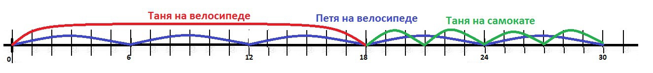Таня ездит на велосипеде втрое быстрее своего младшего брата Пети, а на самокате втрое медленнее, чем он на велосипеде. Таня и Петя, стартовав вместе, поехали на велосипедах, и через 6 минут Таня пересела на самокат. Через сколько минут Петя догонит Таню?
