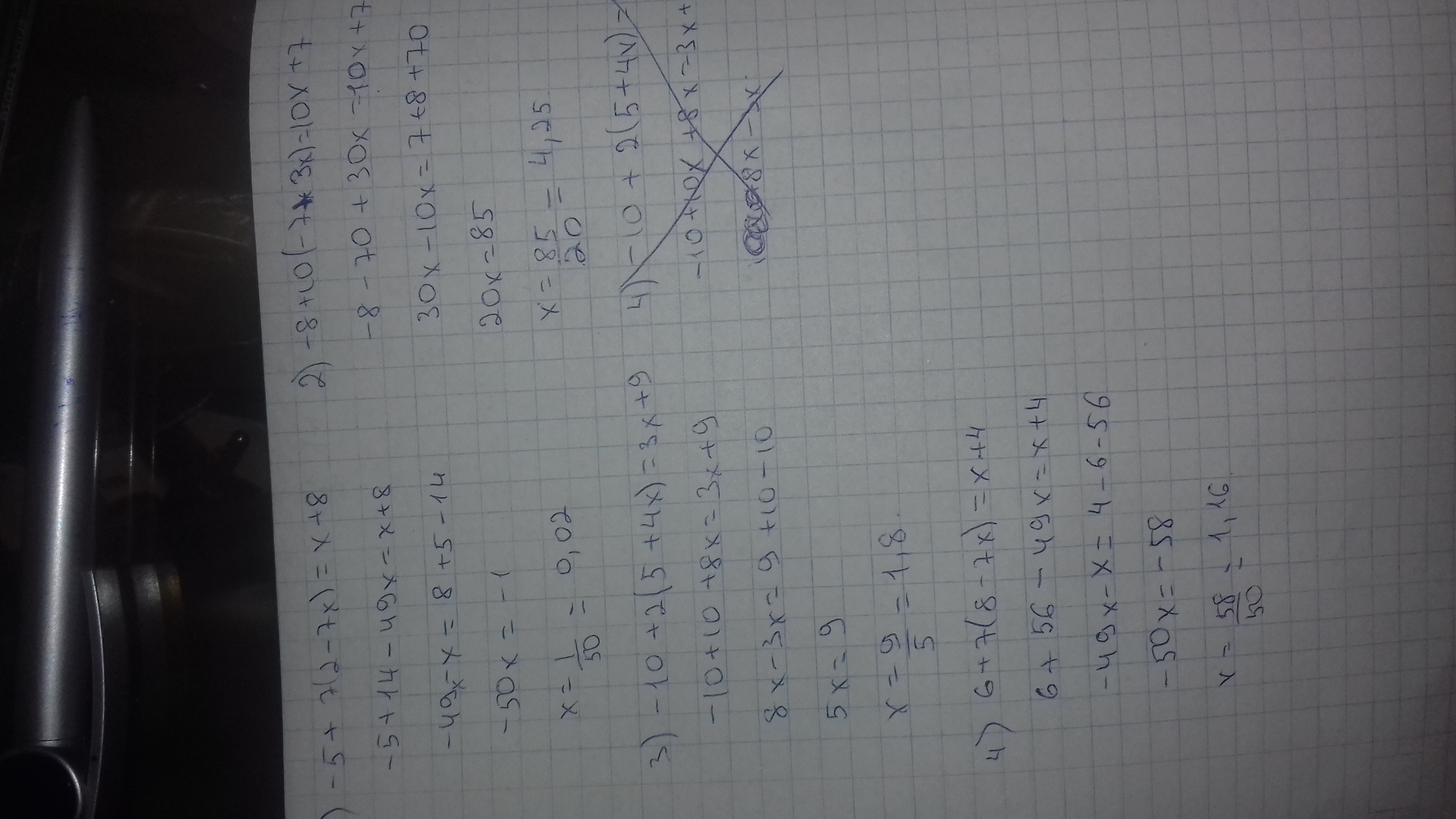 Уравнения. Решение не обязательно, мне нужны ответы, но если вам не лень, то можно и решение написать. Пожалуйста помогите. Заранее спасибо) 6+7(8-7x)=x+4