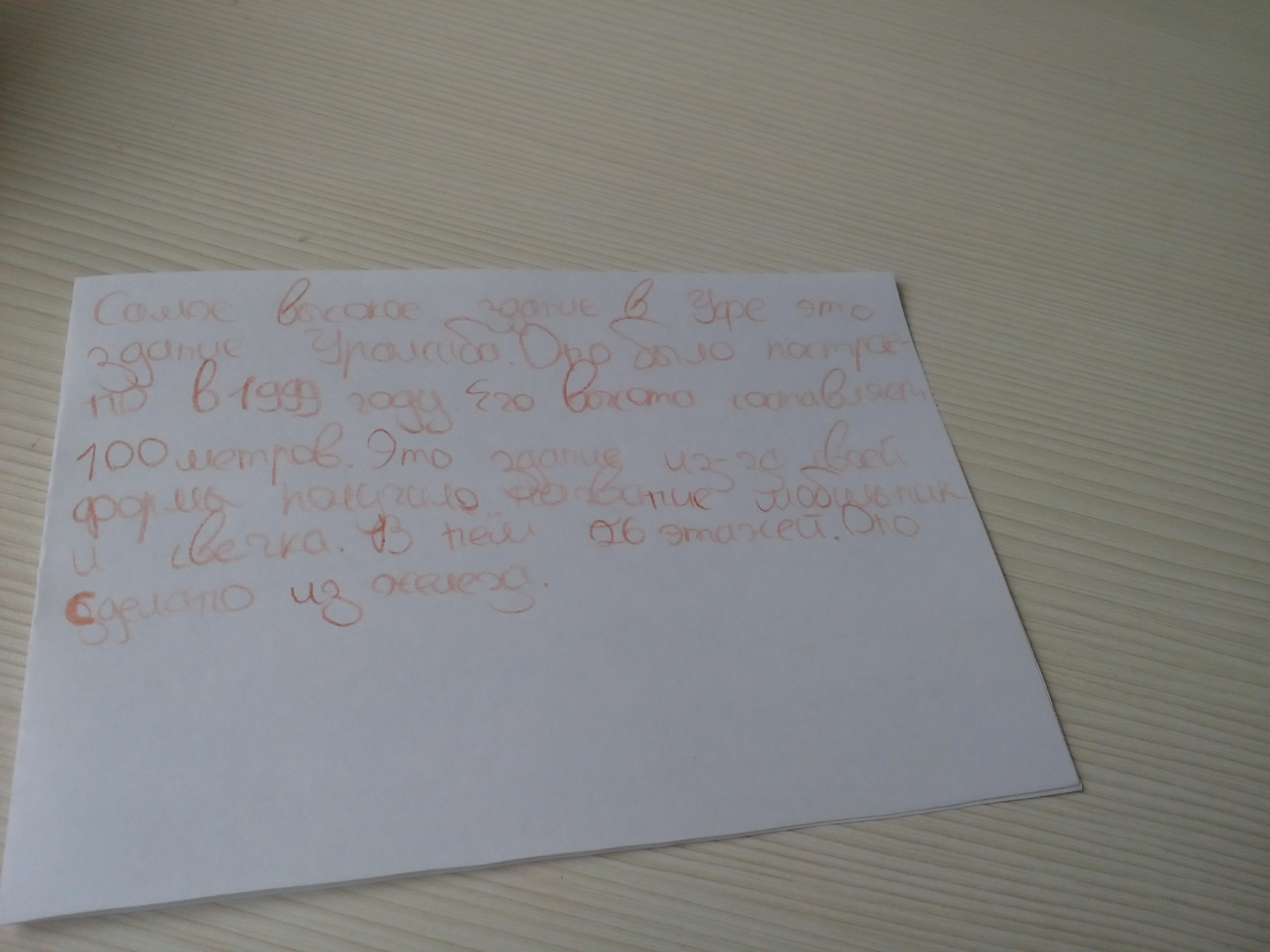 The highest building in UFA is [Name]. It was built in 1999. It is 100 meters in height. This building got the name - "cell phone and candle" due to its shape. It has 26 floors. It was made of iron.