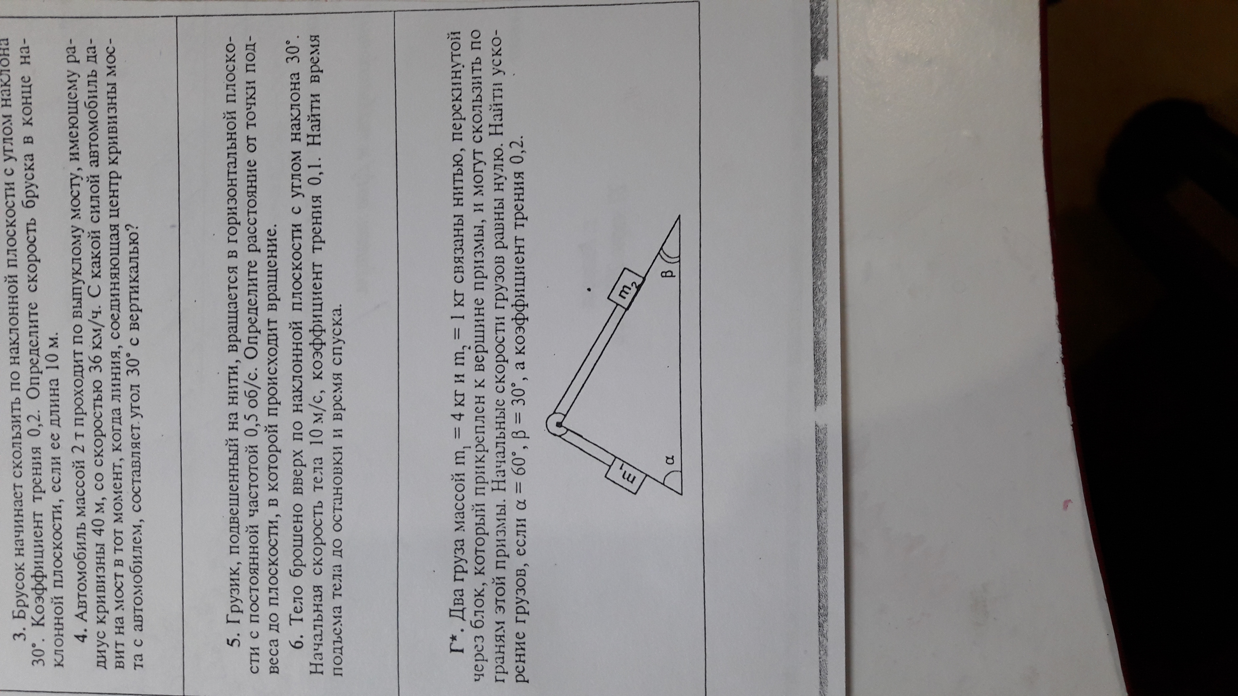 Два груза m1=4кг и m2=1кг связаны нитью, перекинуты через блок, который прикреплен к вершине призмы, и могут скользить по граням этой призмы начальной скоростью грузов равно нулю. Найти ускорение грузов если альфа=60°, бетта=30°, а коэффицент трения 0.2
