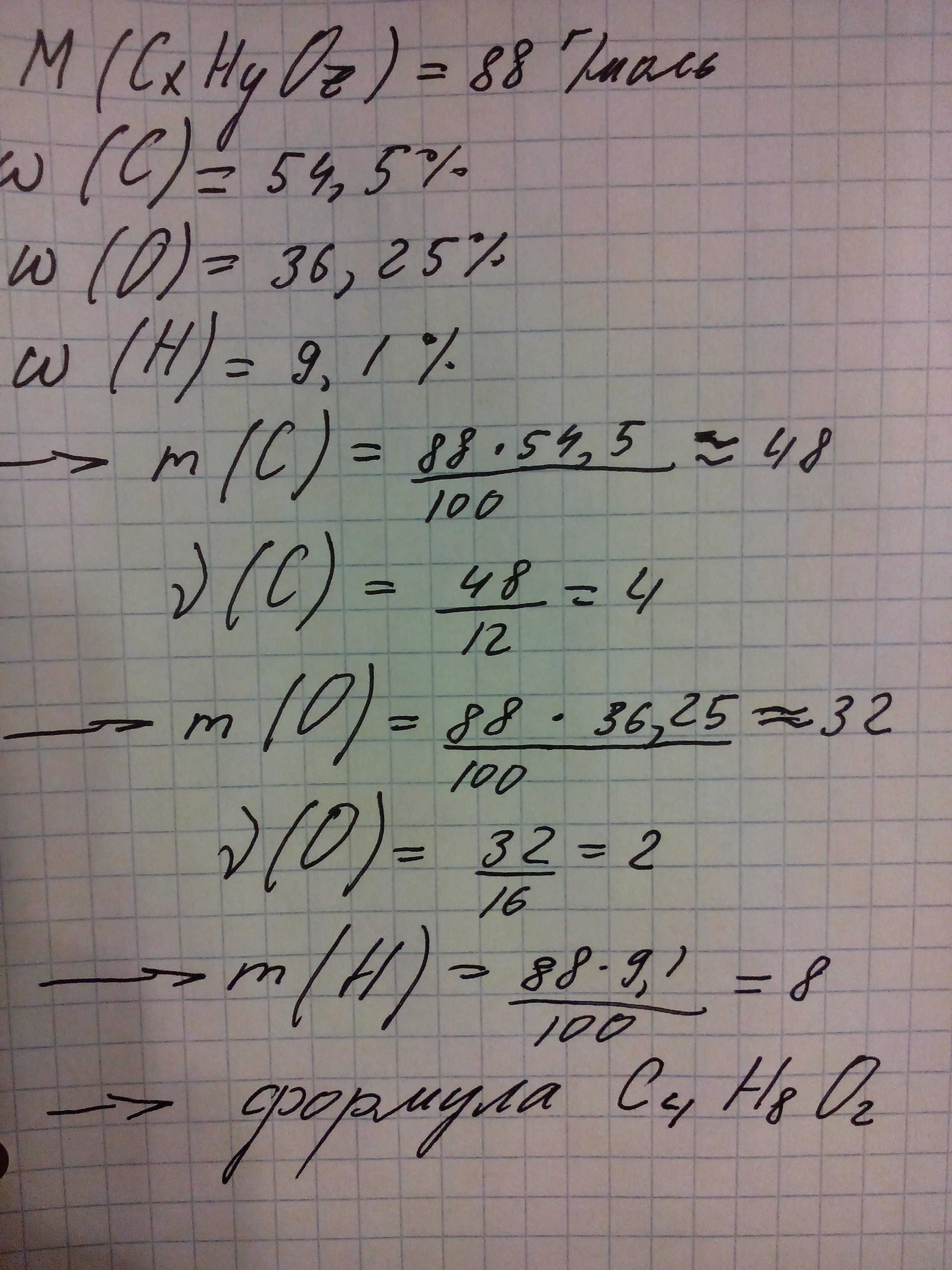 определите формулу содержащий 54.5 углерода 36.25 кислорода и 9.1 водорода молекулярная масса 88