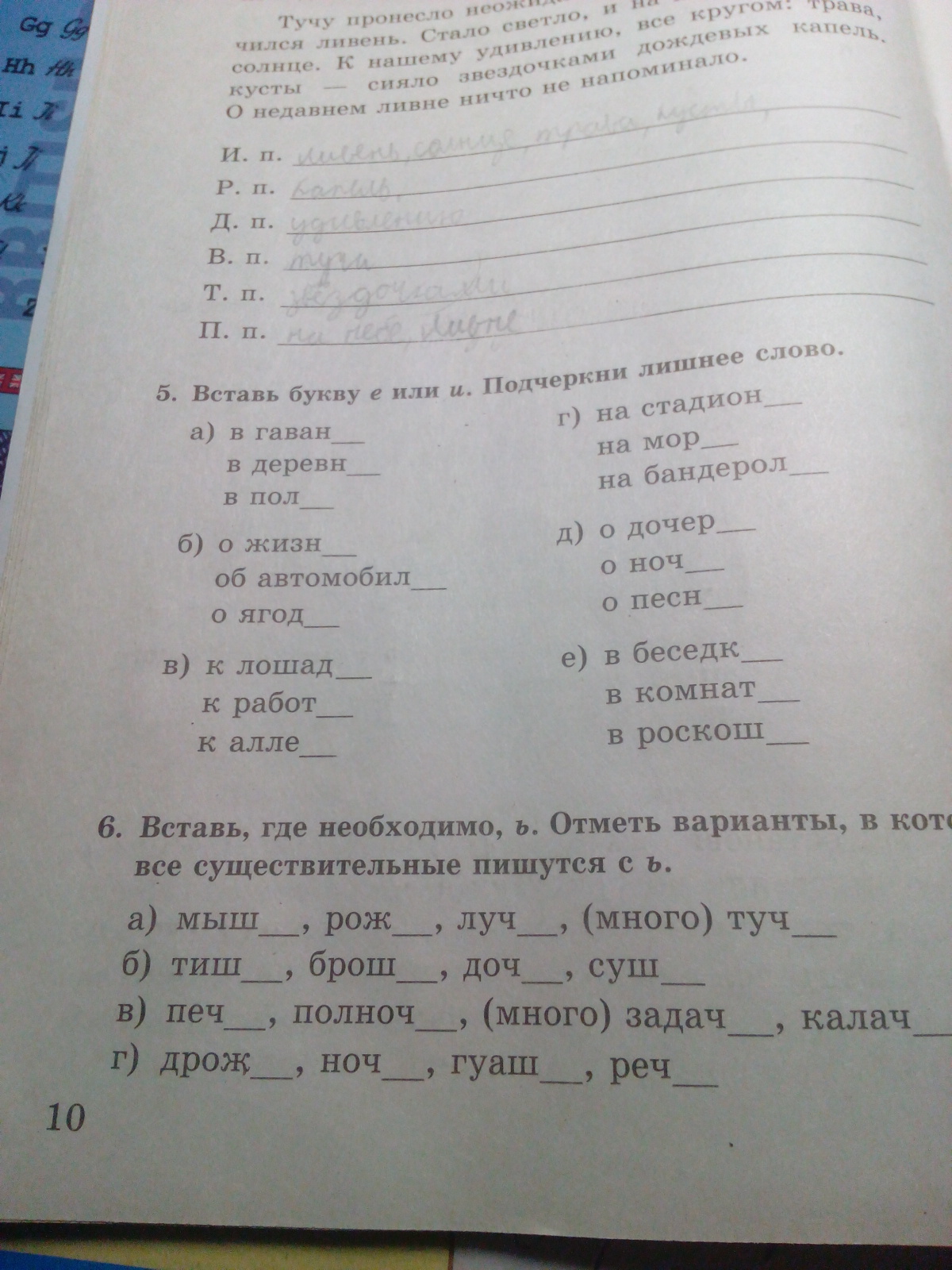 В гавани, в деревне, в поле; о жизни, об автомобиле, о ягоде; к лошади, к работе, к аллее; на стадионе, на море, на бандероли; о дочери, о ночи, о песне; в беседке, в комнате, в роскоши.