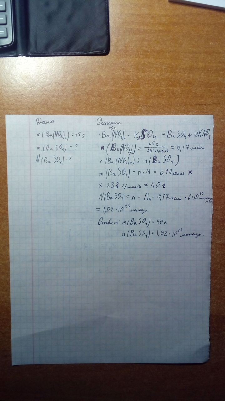 Нитрат бария, массой 45 грамм, вступил в реакцию с сульфатом калия. Найдите массу и количество атомов полученной соли.