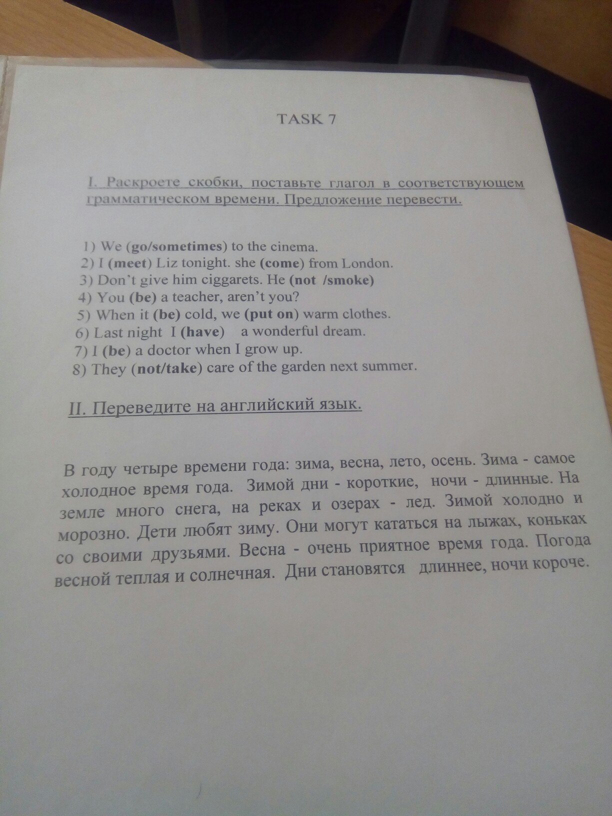 In year four seasons: winter, spring, summer, autumn. Winter is the coldest time of the year. In winter days - short night - long. On the ground, a lot of snow, rivers and lakes - ice. In the winter cold and frosty. Children love winter. They can go skiing, skating with your friends. Spring - a very pleasant time of the year. The weather is warm and sunny spring. The days are getting longer,