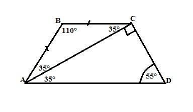 СРОЧНО!Помогите с геометрией пожалуйста. геометрия затра у меня . Диагональ АС трапеции АBCD перпендикулярна ее боковой стороне СD. Основание ВС равно боковой стороне АВ, угол АDC = 55 градусов. Найдите остальные углы этой трапеции.