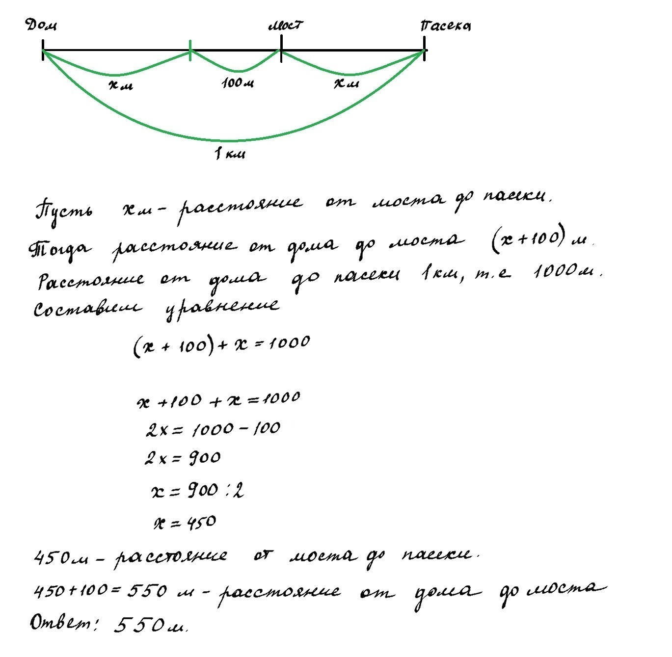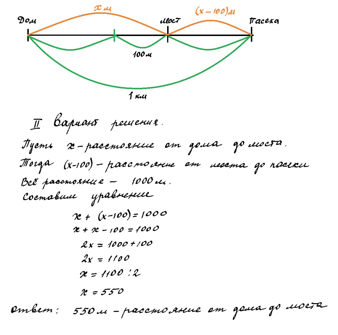 В третье случае за икс взяли расстояние от дома до моста, тогда расстояние от моста до пасеки будет (х-100), т. к. оно на 100 м меньше. Две эти величины складываются и приравниваются к 1000. В этом случае когда мы находим икс, мы сразу отвечаем на главный вопрос задачи, т. е. узнаем расстояние от дома до моста.