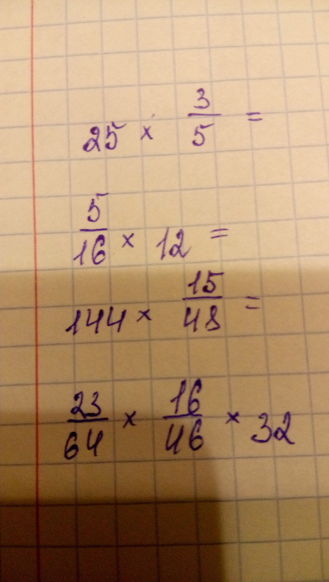 4) Начнем с двух дробей 23/64 и 16/46. Перекрестно их сократим. 46 сокращаем на 23, получаем 2, 23 сокращаем на 23, получаем 1. 64 сокращаем на 16, получаем 4, 16 сокращаем на 16, получаем 1. Имеем: 1/4*1/2=1/8. Но ещё у нас есть 32. Умножаем 1/8 на 32. Получаем 32/8=4.