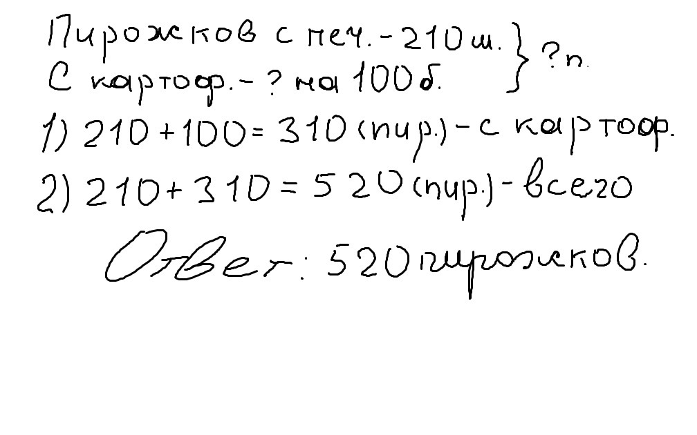 в кулинарии испекли 210 пирожков с печенью а с картофелем на 100 пирожков больше сколько всего пирожков с печенью и картошкой испекли в кулинарии