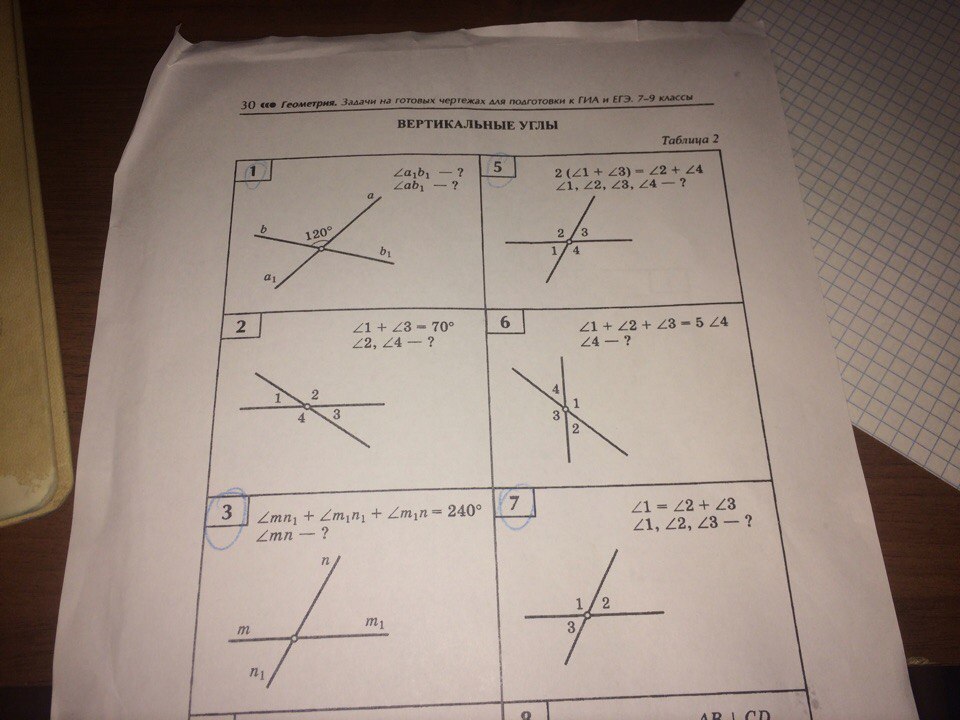 7) угол = 120 градусов, а угол 2 и 3 = 60, 360=2х+х, 360=3х, х=120