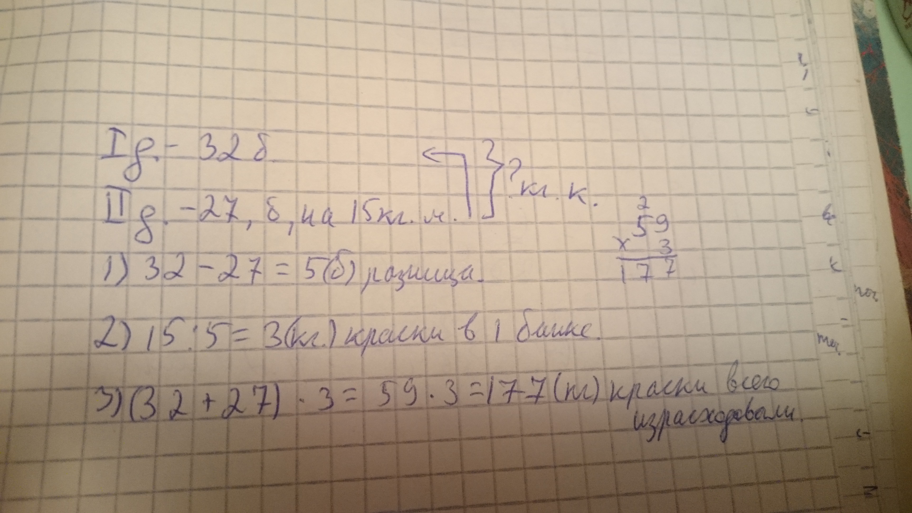 В первый день маляры израсходовали 32 одинаковые банки краски, а во второй 27 таких же банок. Во торой день было израсходовано на 15 кг краски меньше. Сколько краски израсходовали маляры за 2 дня?