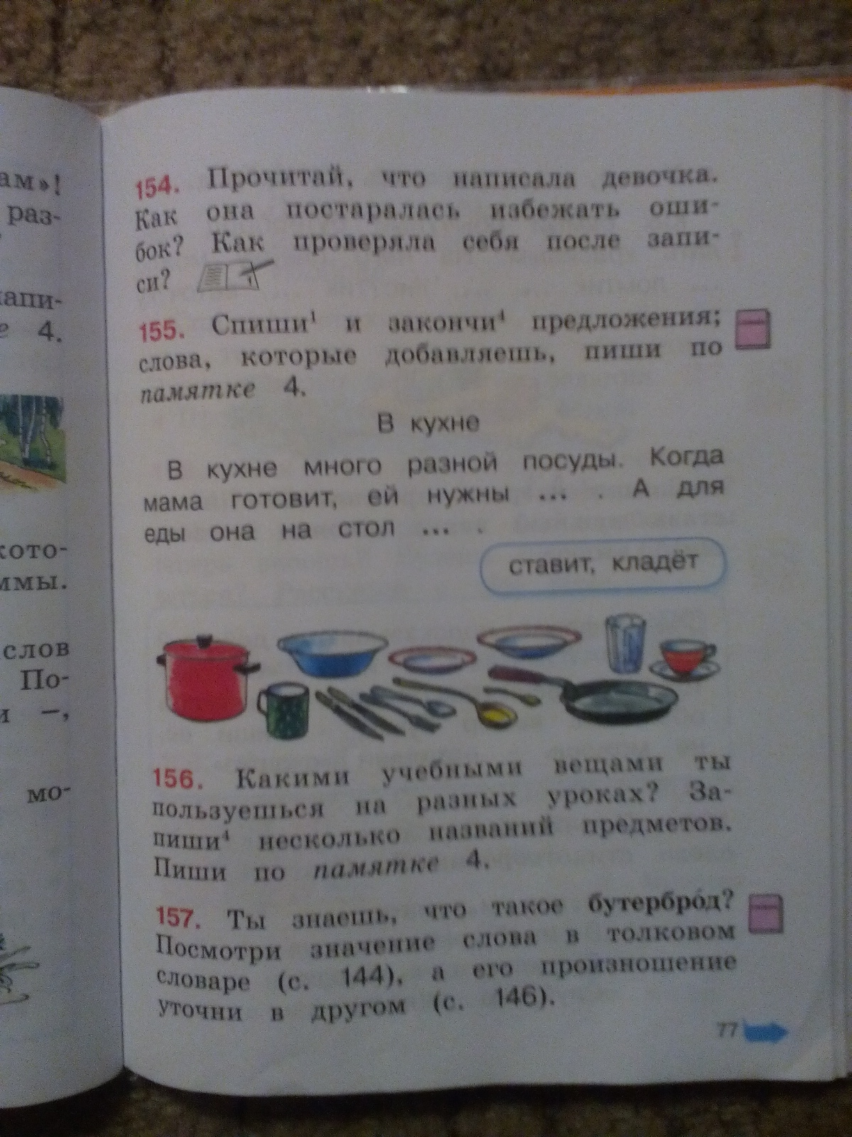 155. Когда мама готовит ей нужны сковородки, кастрюли. А для еды она ставит чашки и тарелки.