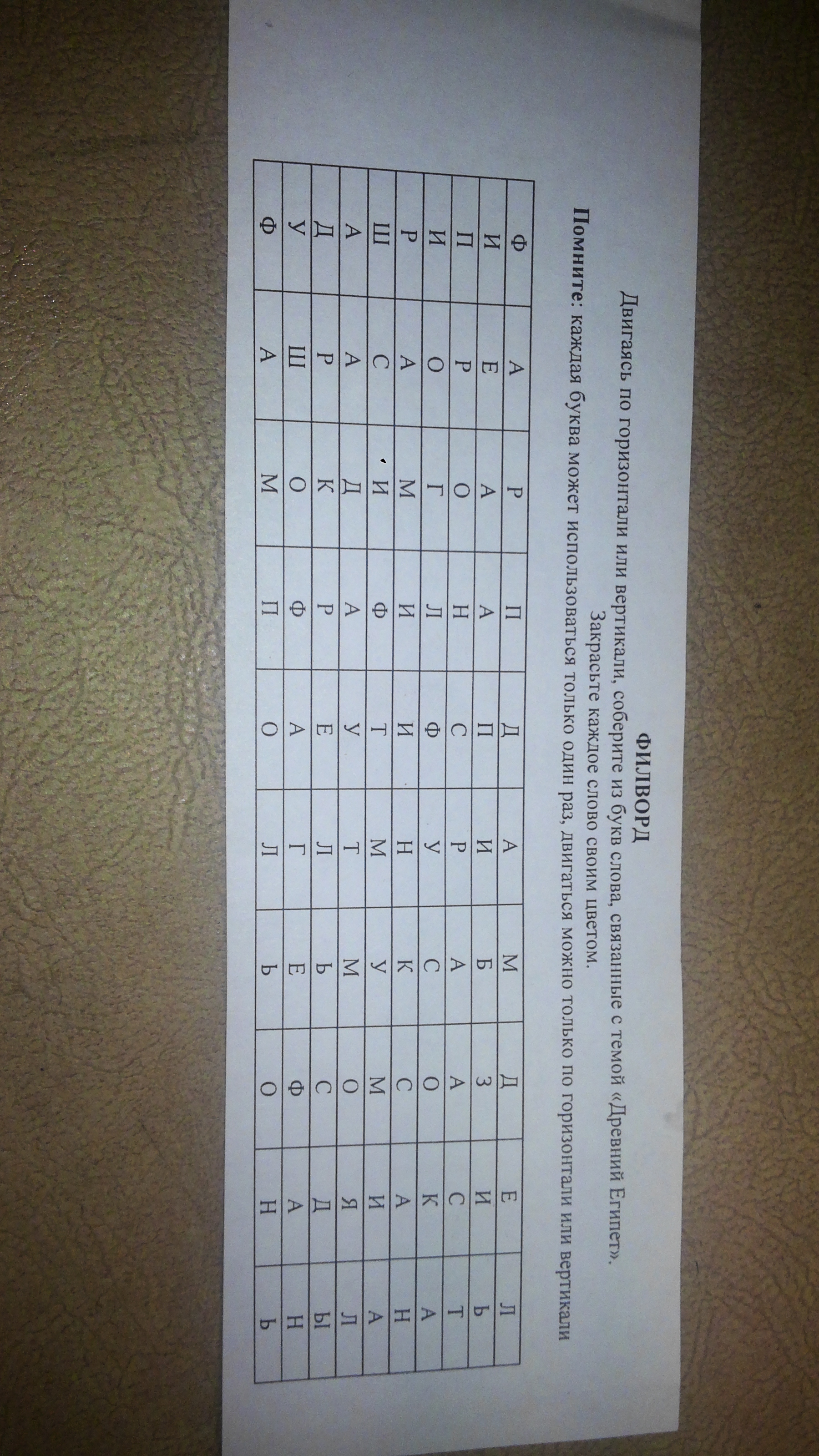 жаль что ничем больше не могу помочь, но я вижу слово "фараон". 1 ряд, 3 первые буквы,2 ряд 3-я буква, 3 ряд, 3-я и 4-ая буква...больше пока не вижу...