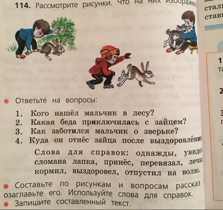 Однажды ________ (Имя) гулял в лесу и встретил зайца.У него была сломана лапка.________ принёс зайца домой , перевязал ему лапу и покормил.Вскоре заяц выздоровел.______ сразу выпустил его на волю.