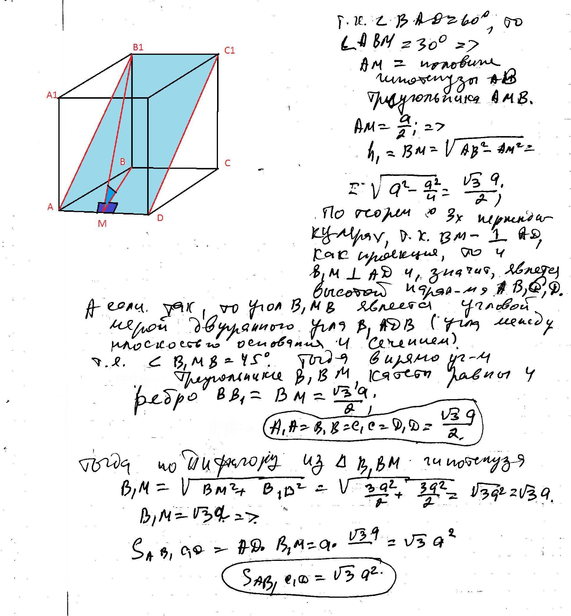 В прямом параллелепипеде основанием служит ромб со стороной, равной a, угол BAD = 60 градусов. Через сторону AD и вершину B1 проведена плоскость, составляющая с плоскостью основания угол 45 градусов. Найдите длину бокового ребра и площадь сечения.(нарисуйте плиз еще сечение, если можно)