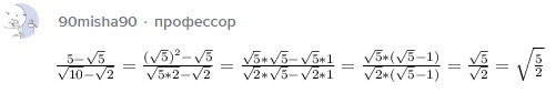 frac{5-sqrt{5}}{sqrt{10}-sqrt{2}}=frac{(sqrt{5})^2-sqrt{5}}{sqrt{5*2}-sqrt{2}}=frac{sqrt{5}*sqrt{5}-sqrt{5}*1}{sqrt{2}*sqrt{5}-sqrt{2}*1}=frac{sqrt{5}*(sqrt{5}-1)}{sqrt{2}*(sqrt{5}-1)}=frac{sqrt{5}}{sqrt{2}}=sqrt{frac{5}{2}}