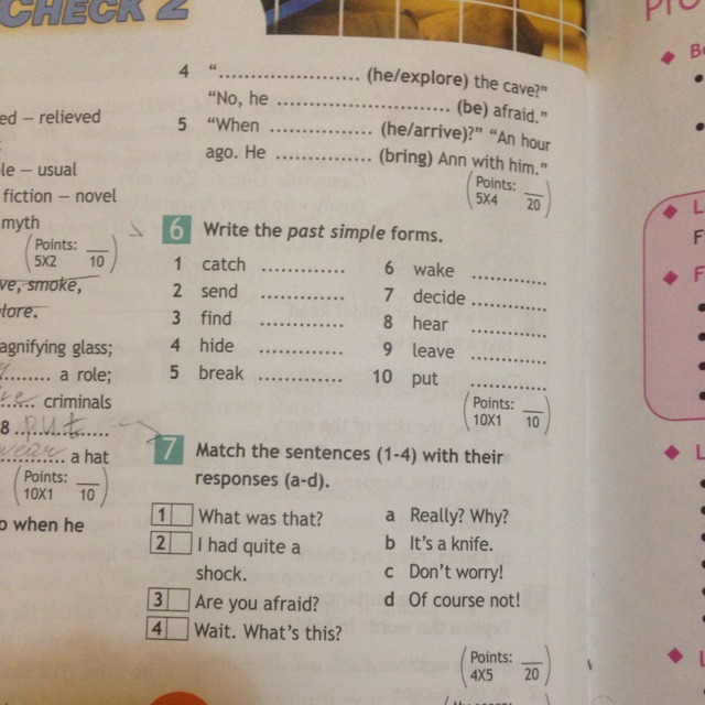 6) caught, sent, found, hide, broke, woke, decided, heard, left, put.