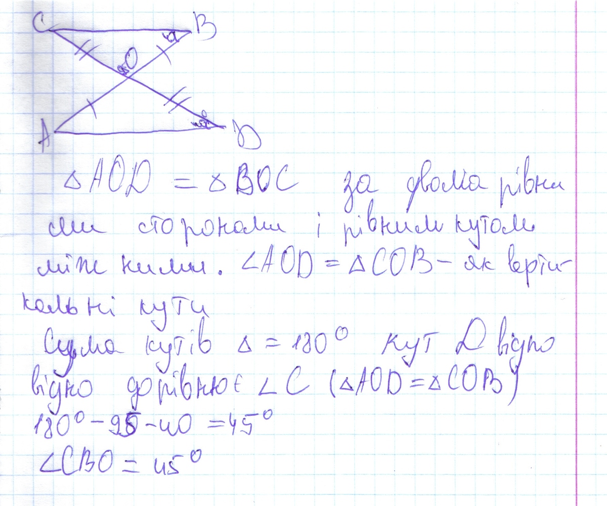 Отрезка AB и CD пересикаются в точке O,которая является серединой каждого из них. а) Докажите,что треугольник AOD = треугольнику BOC. б)Найдите угол OBC,если угол ODA=40 градусов,угол BOC = 95 градусов