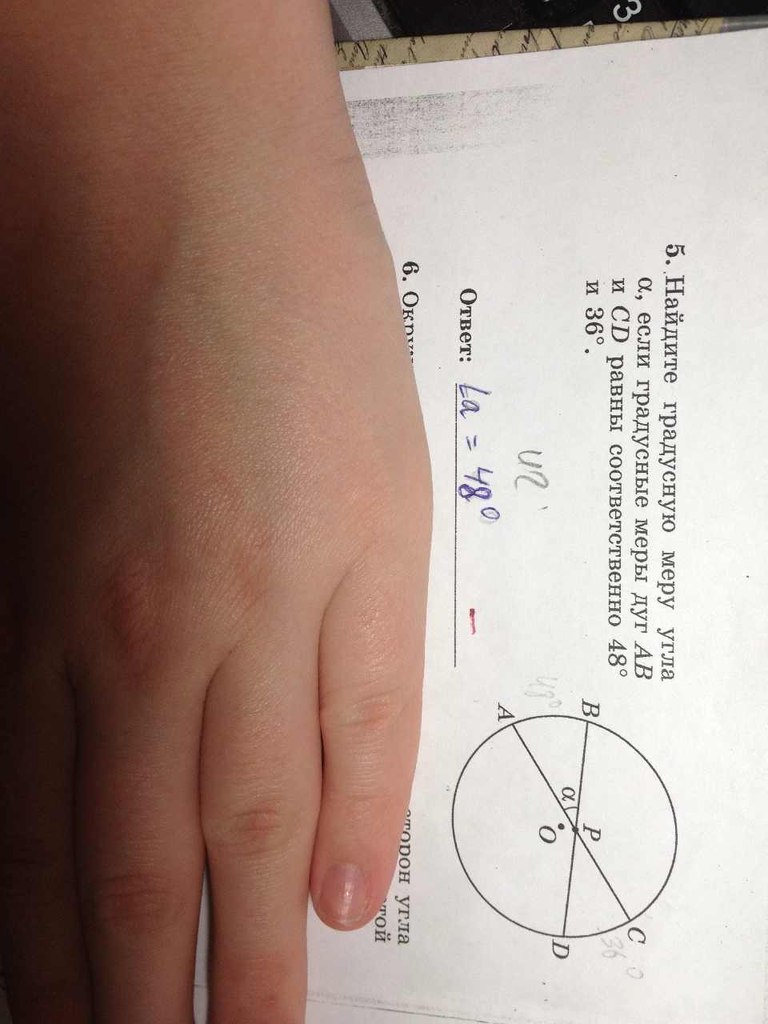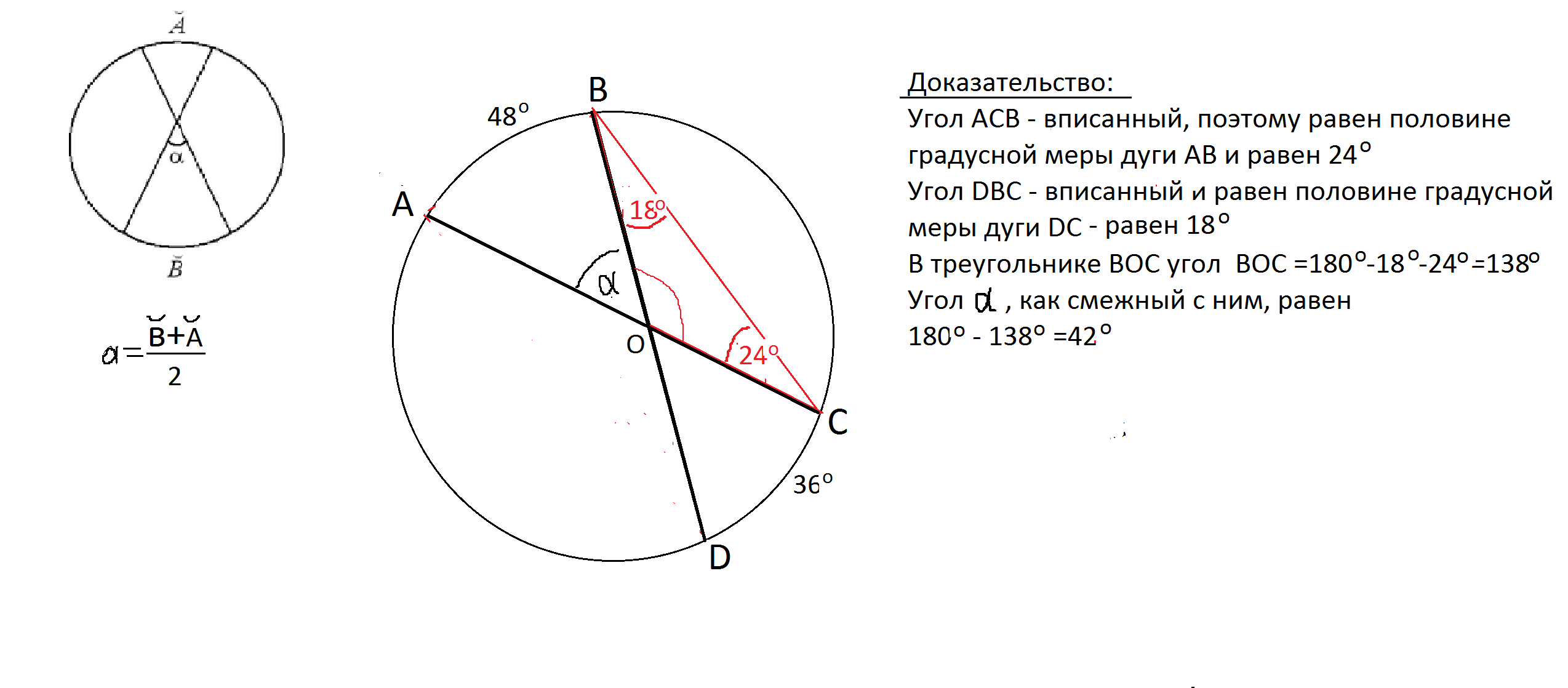 найдите градусную меру угла а если градусные меры его дуг ab и cd соответственно равны48 и 36 градусам