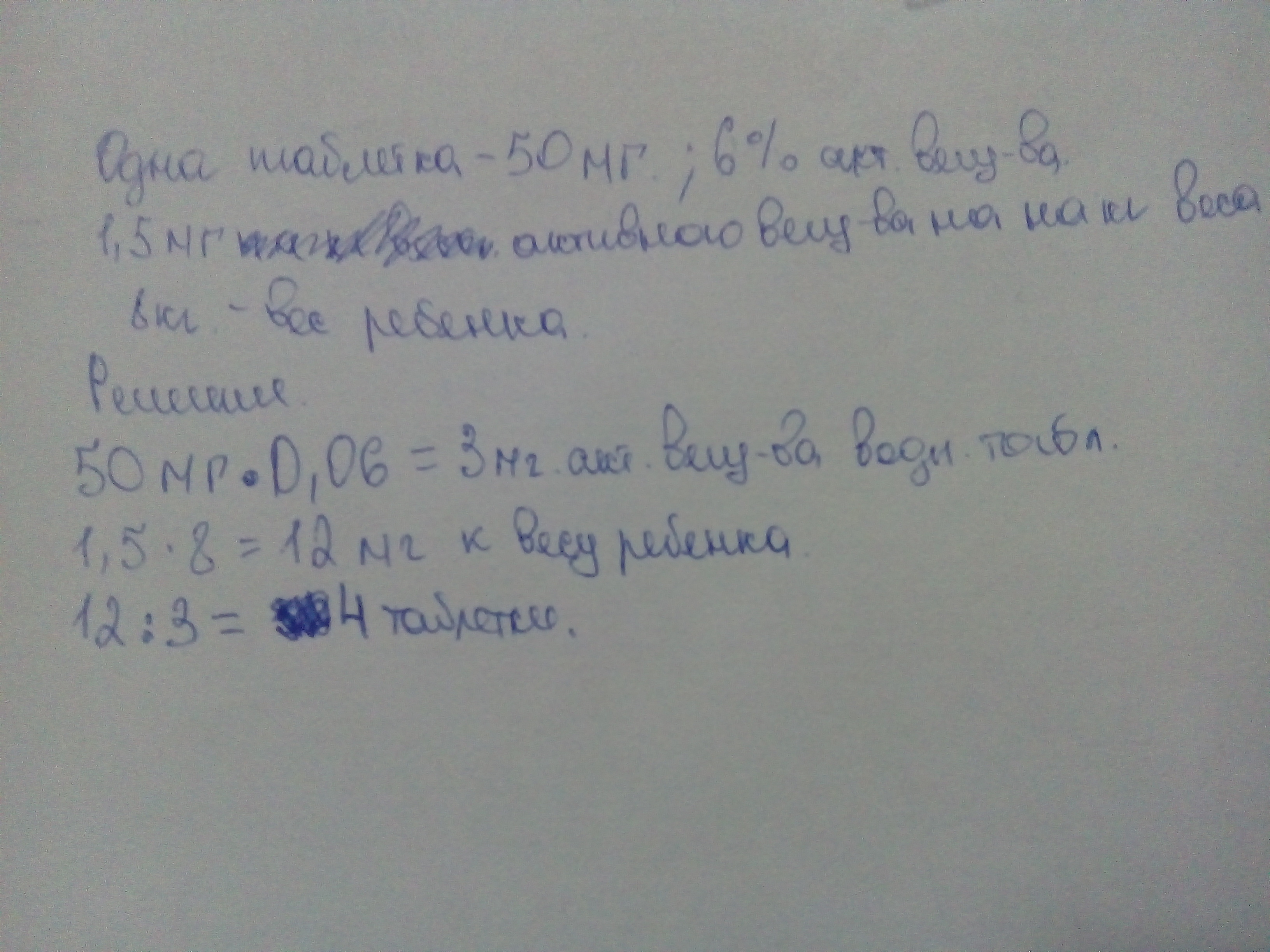 Одна таблетка лекарства весит 50 мг и содержит 6% активного вещества. Ребёнку в возрасте до 10 месяцев врач про писал 1,5 мг активного вещества на каждый кг веса в сутки. Сколько таблеток этого лекарства следует дать ребёнку весом 8 кг в течение суток ?